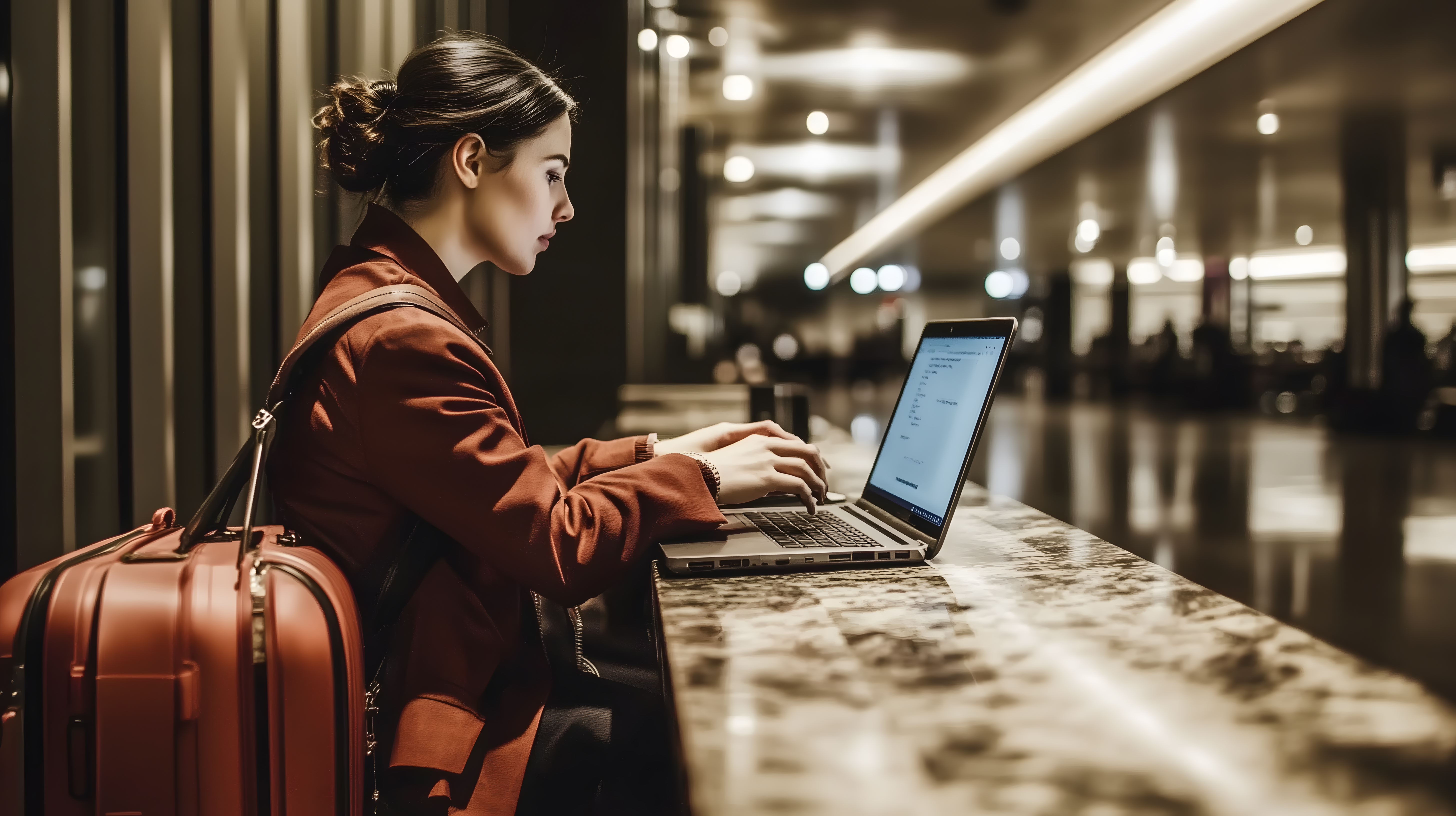 Das Bild zeigt eine Geschäftsfrau, die konzentriert an ihrem Laptop in einer Flughafenlounge arbeitet. Sie sitzt an einem Marmortisch und hat einen Koffer neben sich stehen. Die Lounge ist durch helle, warme Beleuchtung und ein modernes, minimalistisches Design geprägt. Das Bild vermittelt den Eindruck von Mobilität, Produktivität und Geschäftsmäßigkeit. Dieses hochauflösende Stockfoto eignet sich hervorragend für Blogbeiträge, Werbeanzeigen oder Newsletter zum Thema Reisen, Arbeit, Unternehmertum oder Büroalltag. Es steht unter der Creative-Commons-Lizenz zur kostenlosen Nutzung zur Verfügung.