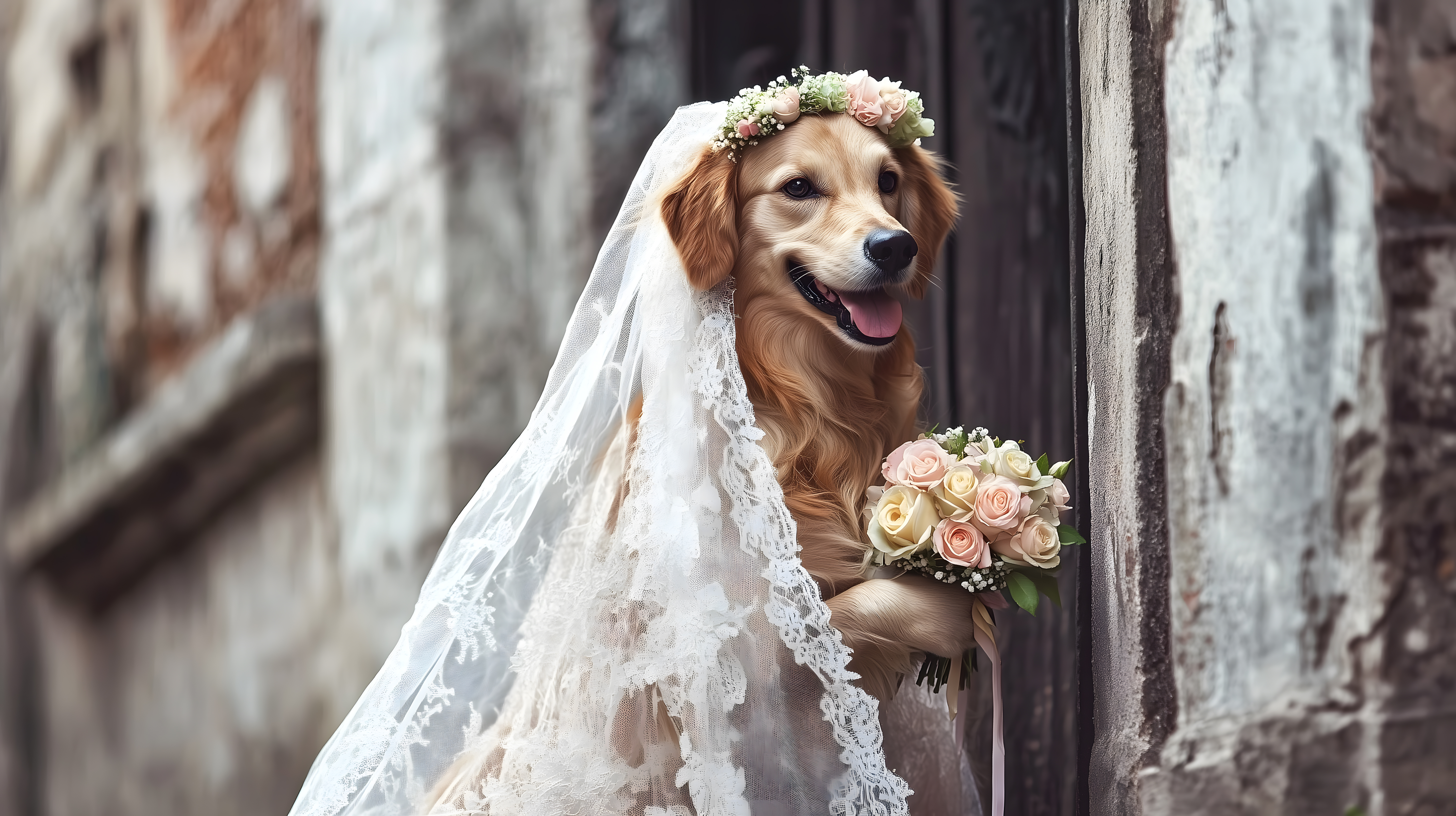 Das Foto zeigt einen Golden Retriever, der in einem Brautkleid mit Blumenkranz und Schleier zu sehen ist. Der Hund hält einen Blumenstrauß in den Pfoten und lächelt fröhlich in die Kamera. Die Aufnahme wurde vor einer alten, rustikalen Holztür aufgenommen, was dem Bild einen natürlichen und romantischen Charakter verleiht. Dieses kostenlose Stockfoto in hoher Auflösung unter Creative-Commons-Lizenz eignet sich perfekt für den Einsatz in Hochzeitsthemen, Tierblogbeiträgen oder emotionalen Werbematerialien.
