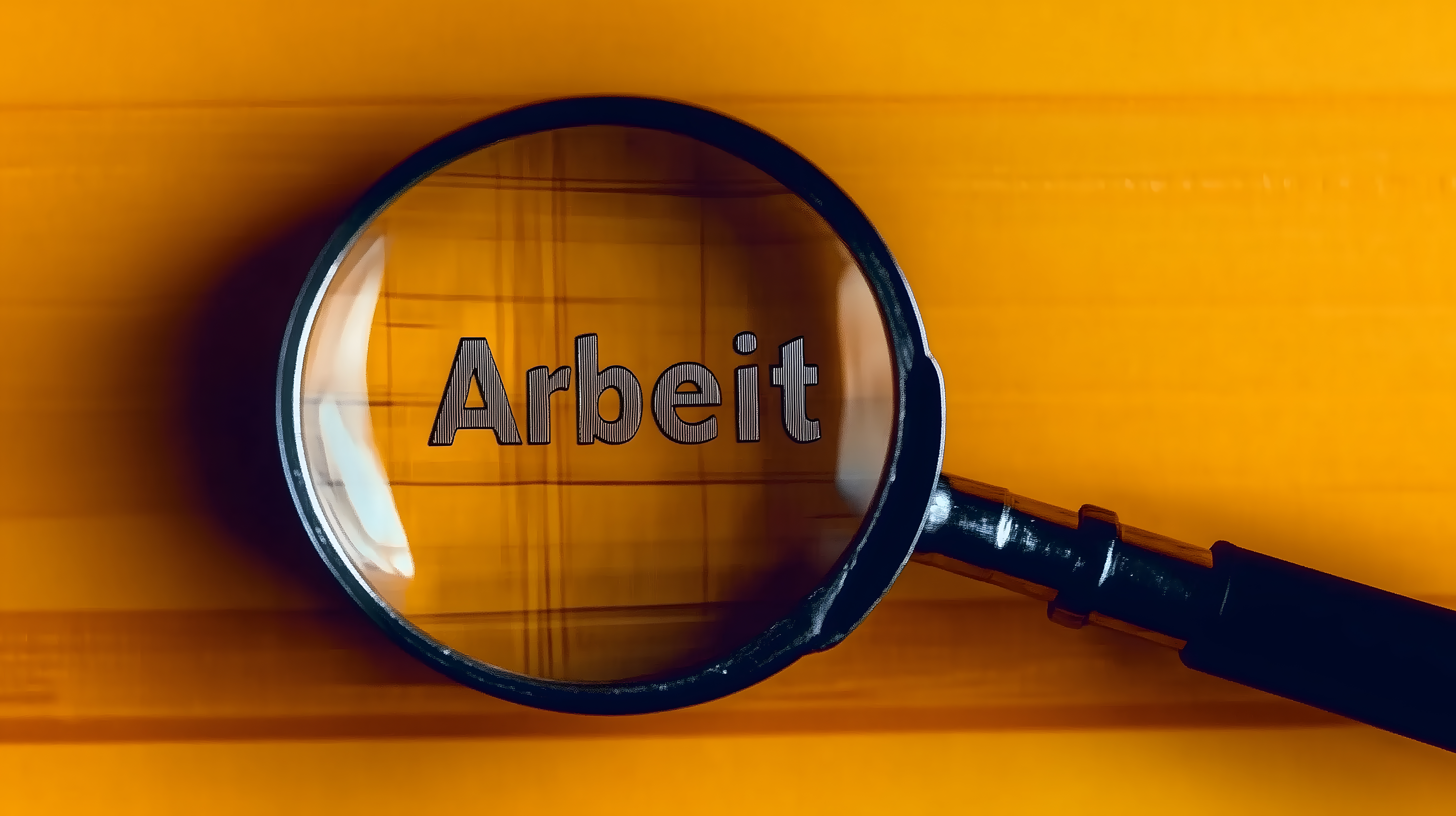 Dieses Bild zeigt eine Lupe, die auf den Schriftzug 'Arbeit' gerichtet ist, vor einem orangefarbenen Hintergrund. Das Foto symbolisiert die genaue Betrachtung und Analyse von Arbeitsprozessen, zum Beispiel im Kontext von Suchmaschinenoptimierung. Die kontrastreiche Farbgebung in Blau und Orange sowie die Unschärfe um den Schriftzug herum verleihen dem Bild eine visuelle Dynamik und Fokussierung.