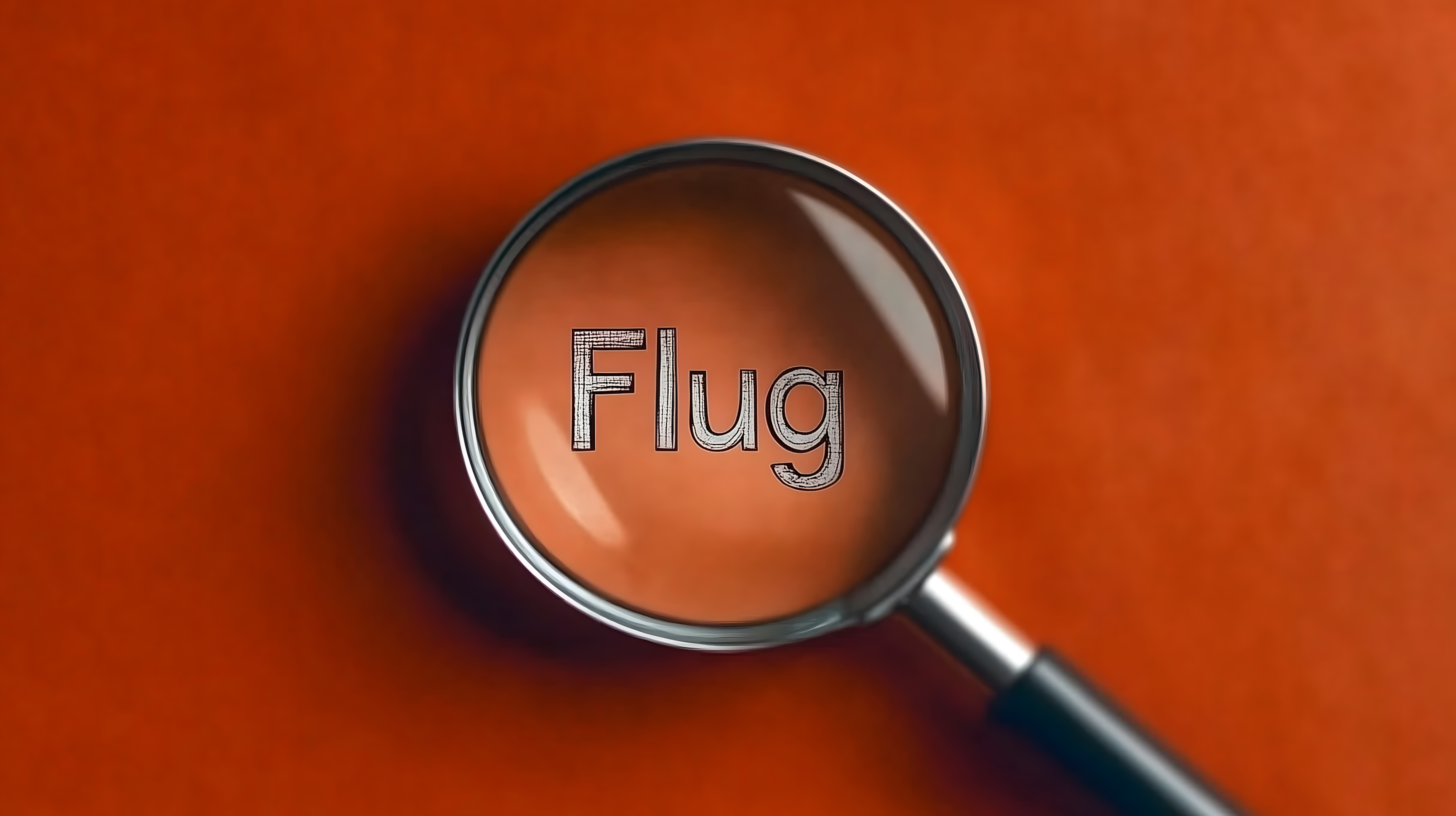 Das Bild zeigt eine Nahaufnahme einer klassischen Lupe vor einem leuchtend orangefarbenen Hintergrund. Im Mittelpunkt der Lupe ist der Begriff 'Flug' zu sehen, was das zentrale Motiv und Konzept dieses Stockfotos darstellt. Die Perspektive und Komposition lenken den Blick des Betrachters direkt auf den Schlüsselbegriff, der durch die Vergrößerung hervorgehoben wird.