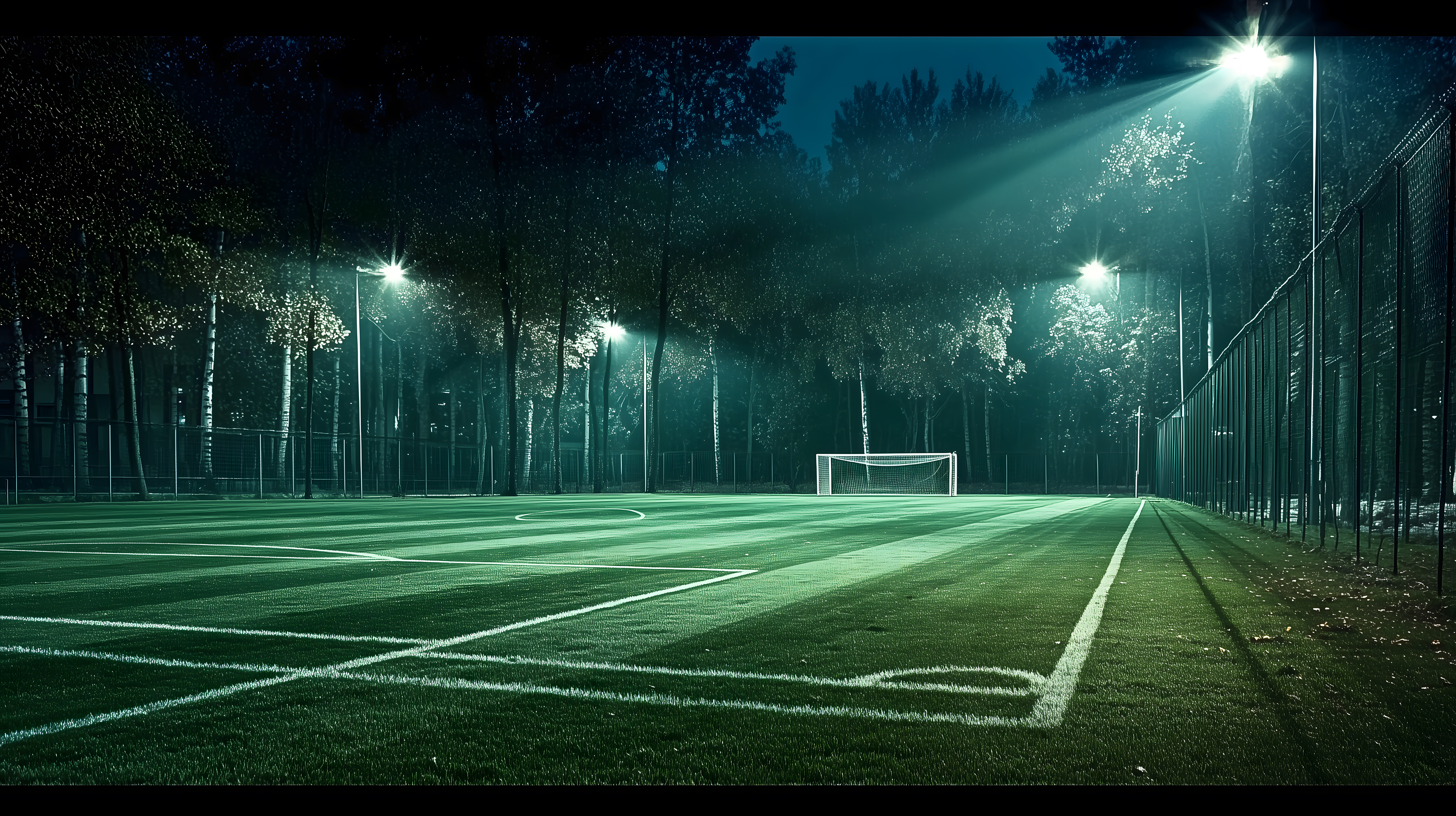 Dieses faszinierende Foto zeigt einen Fußballplatz in einer ruhigen, waldigen Umgebung bei Nacht. Die Szenerie ist stimmungsvoll beleuchtet, sodass der grüne Kunstrasen und die umgebenden Bäume in einem mystischen Licht erscheinen. Die Flutlichtmasten werfen ihre Strahlen über das Feld und verleihen der Szene eine einzigartige Atmosphäre. Dieses kostenlose Stockfoto in hoher Auflösung unter der Creative-Commons-Lizenz eignet sich hervorragend für Hintergründe, Illustrationen oder Designs in Zusammenhang mit Fußball, Sport, Outdoor-Aktivitäten und stimmungsvollen Nachtaufnahmen.