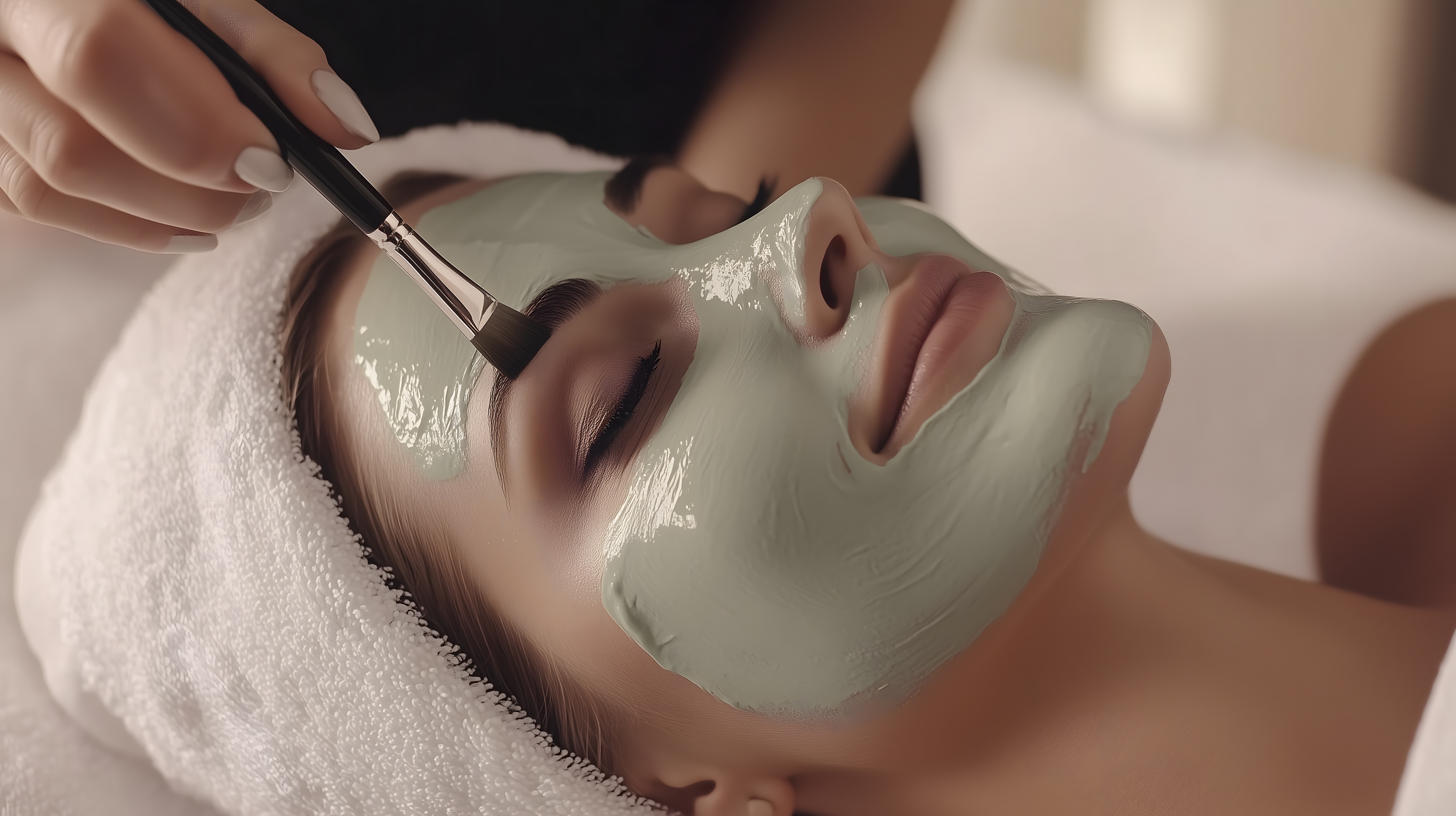 Das Bild zeigt eine Frau, die eine entspannende Gesichtsbehandlung in einem Wellness-Spa genießt. Sie liegt auf einer Behandlungsliege, während eine Kosmetikerin ihr eine grüne, feuchtigkeitsspendende Gesichtsmaske aufträgt. Die Frau hat die Augen geschlossen und scheint in einem Zustand der vollkommenen Entspannung zu sein. Das Foto vermittelt eine Atmosphäre von Ruhe, Luxus und Wohlbefinden, wie sie in einem modernen Wellnessbereich zu finden ist. Dieses hochwertige Stockfoto in hoher Auflösung eignet sich ideal für den Einsatz in Blogs, Newslettern, Social-Media-Beiträgen oder Werbematerialien zum Thema Beautypflege, Wellness und Erholung. Es steht unter einer kostenlosen Creative-Commons-Lizenz zur Verfügung.