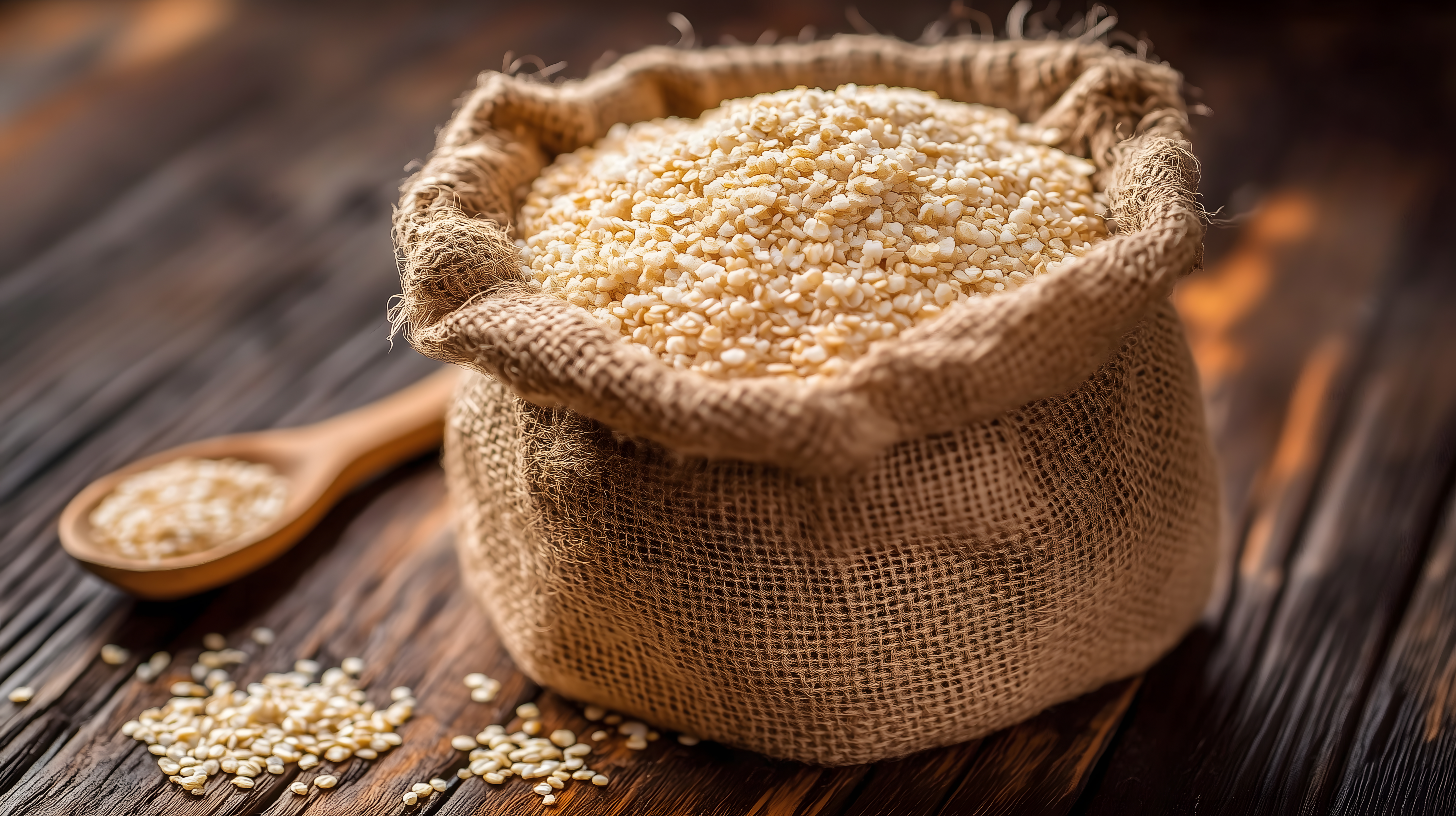 Dieses Foto zeigt einen rustikalen Jutesack voller goldener Hirsekörner auf einem dunklen Holztisch. Die Textur des Sackmaterials und der Körner erzeugt ein natürliches, erdiges Ambiente. Die Hirse ist ein gesunder, glutenfreier Vollkornrohstoff, der häufig in der veganen und biologischen Küche Verwendung findet. Das Bild eignet sich ideal für die Verwendung in Blogs, Newslettern oder auf Social-Media-Kanälen zum Thema gesunde Ernährung, Kochen und Backen mit naturbelassenen Zutaten. Als hochaufgelöstes, kostenloses Stockfoto unter Creative-Commons-Lizenz kann es frei genutzt werden.