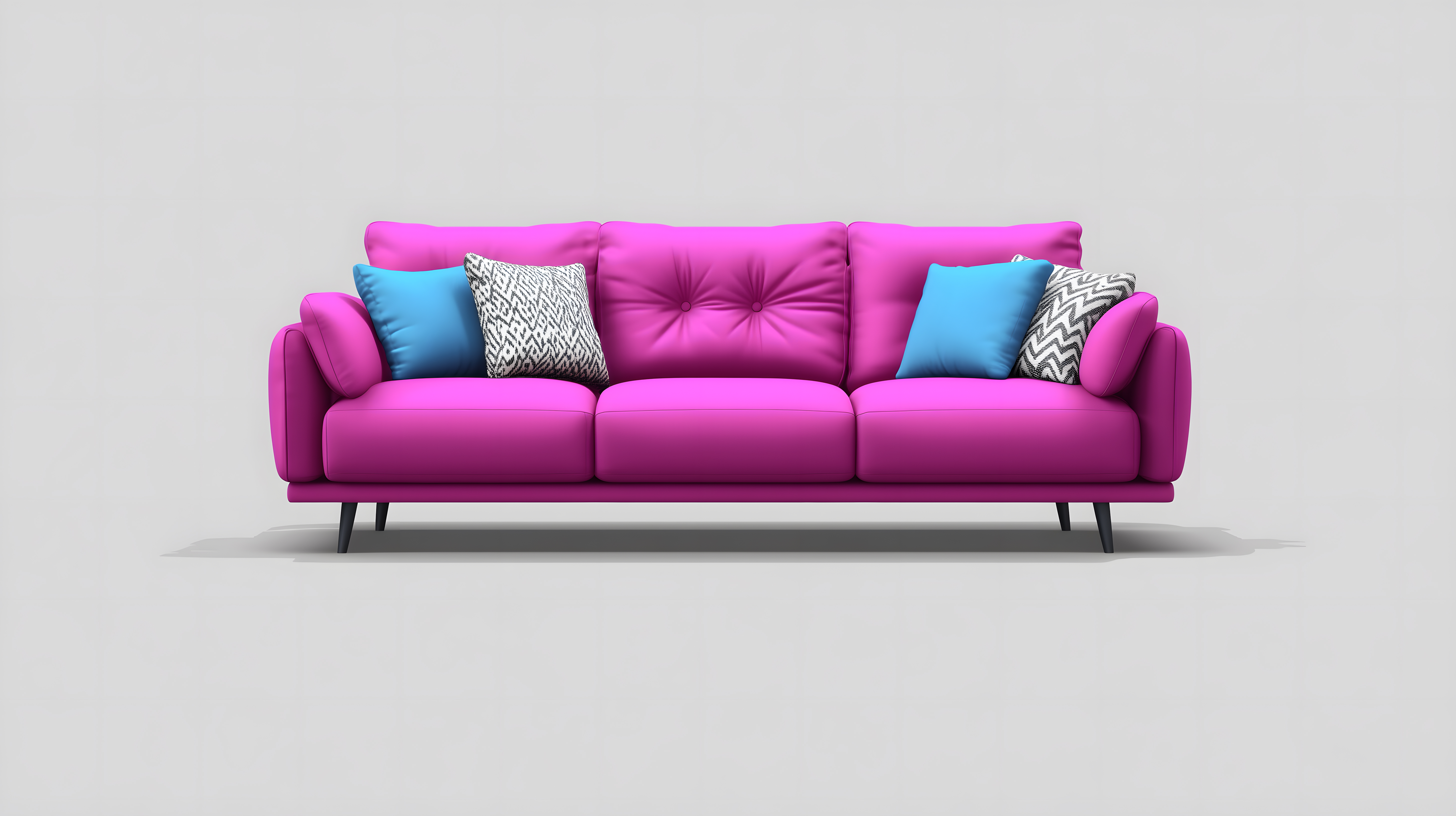 Dieses Foto zeigt ein modernes, pinkes Sofa mit bunten Kissen. Das Sofa hat eine einfache, skandinavische Form mit tiefen Sitzpolstern und sieht sehr gemütlich und einladend aus. Die Kissen in türkis, weiß und schwarz-weiß betonen den modernen Look und schaffen farbliche Akzente. Das Foto eignet sich hervorragend als Stockfoto für Blogs, Newsletter, Social-Media-Posts oder Werbematerialien rund um Wohnen, Einrichtung und Lifestyle. Es ist in hoher Auflösung und unter einer Creative-Commons-Lizenz verfügbar.