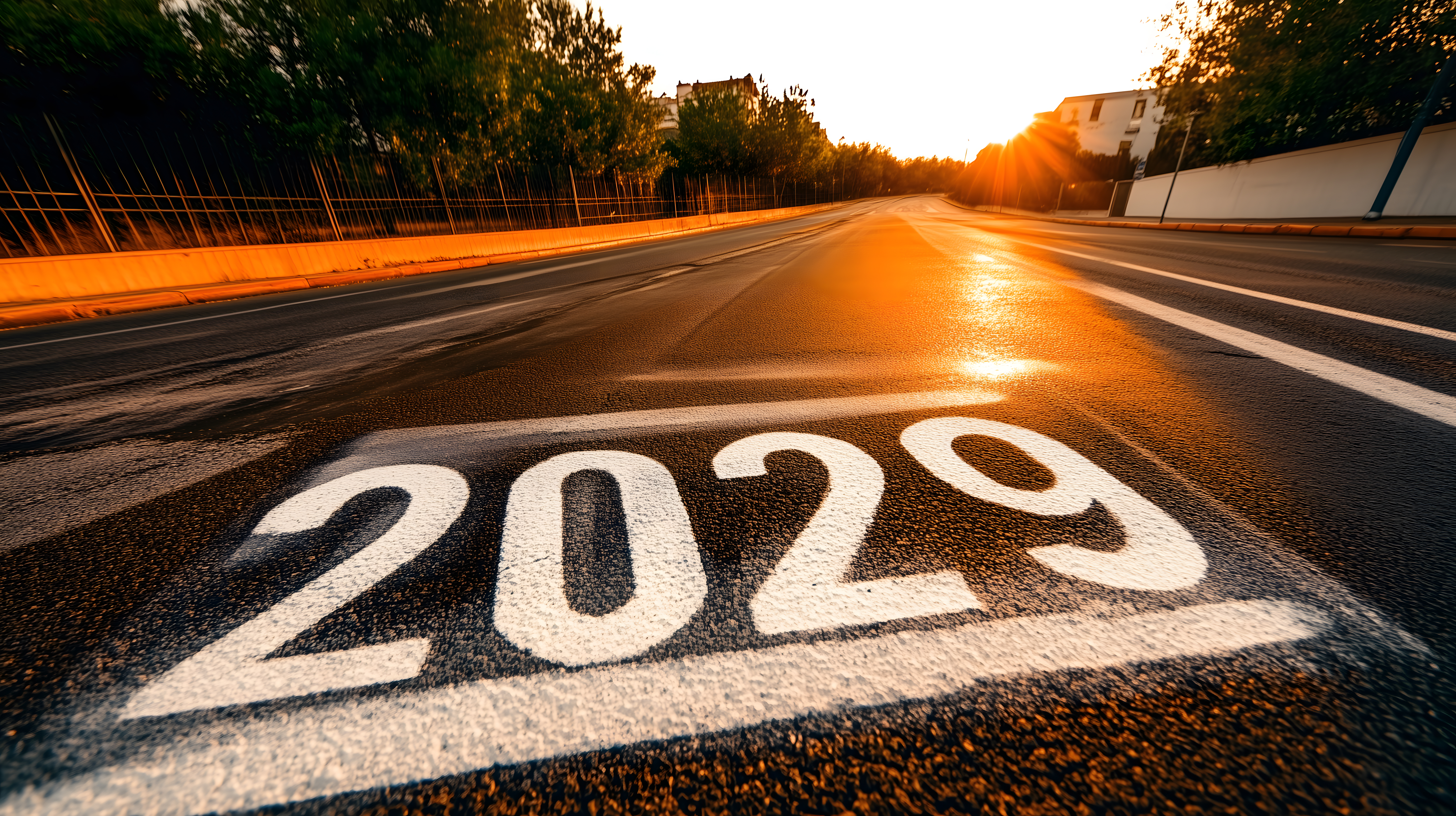 Dieses eindrucksvolle Foto zeigt eine leere Straße bei Sonnenuntergang, auf der die Jahreszahl 2029 deutlich zu sehen ist. Die warmen, orangefarbenen Lichtstrahlen der untergehenden Sonne werfen einen stimmungsvollen Glanz auf die Straßenoberfläche und lassen die Zahlen fast zu leuchten scheinen. Die Perspektive des Bildes führt den Blick geradewegs in Richtung Horizont, was den Eindruck von Weite und Möglichkeiten vermittelt.