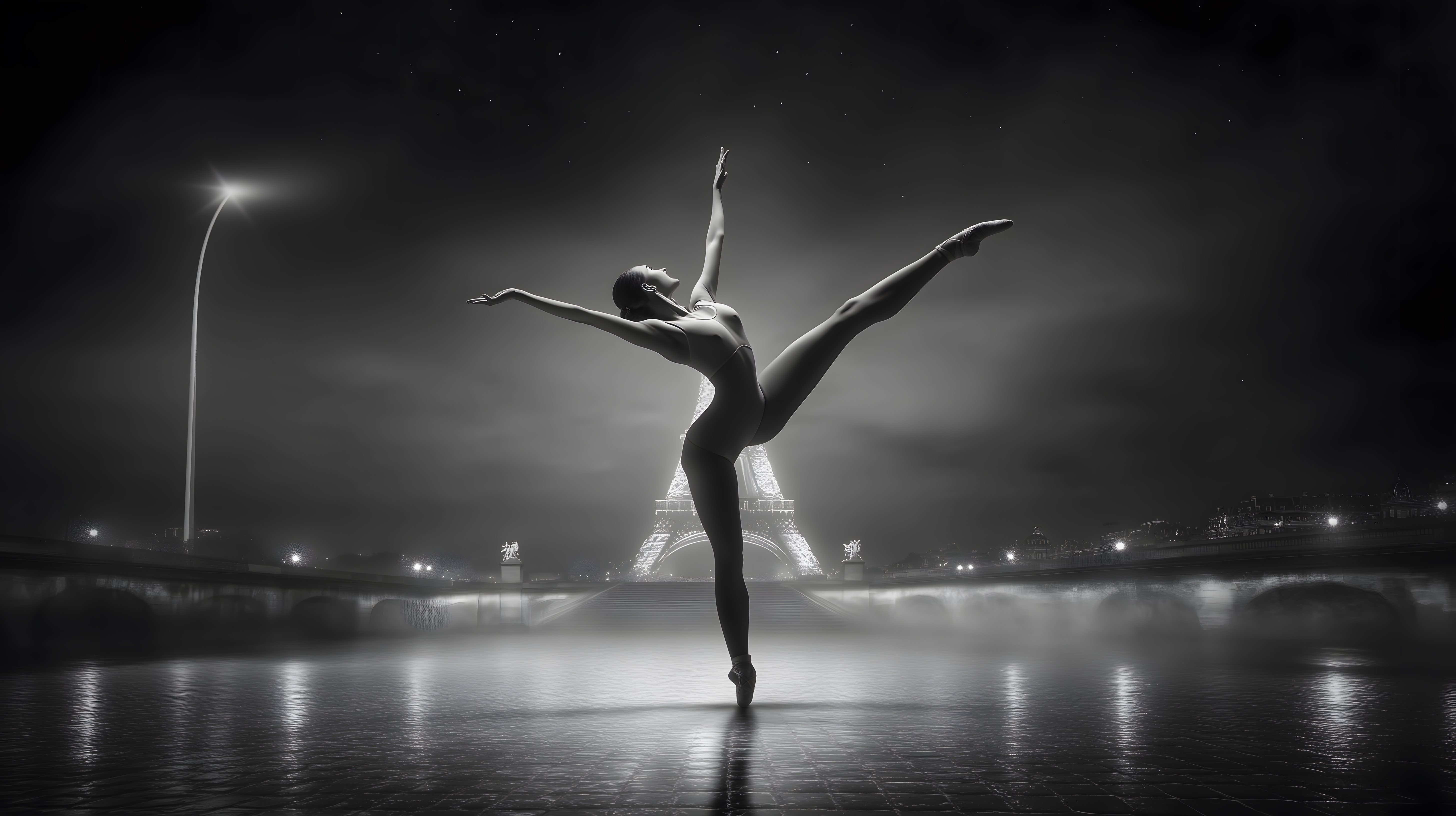 Dieses beeindruckende Schwarzweißfoto zeigt die Silhouette einer Ballerina, die elegant vor dem Eiffelturm in Paris tanzt. Die Tänzerin schwebt anmutig über dem Wasser, ihre Arme und Beine zu einer Bewegung gespreizt, während die Lichter der Stadt im Hintergrund eine stimmungsvolle Kulisse bilden. Die Komposition ist ausgewogen und lässt den Fokus ganz auf der tänzerischen Pose liegen. Dieses hochwertige Stockfoto eignet sich hervorragend für Blogs, Newsletter, Social-Media-Beiträge und Werbematerialien in den Bereichen Tanz, Kunst, Lifestyle und Reise. Es steht unter einer Creative-Commons-Lizenz zur freien Nutzung in hoher Auflösung zur Verfügung.