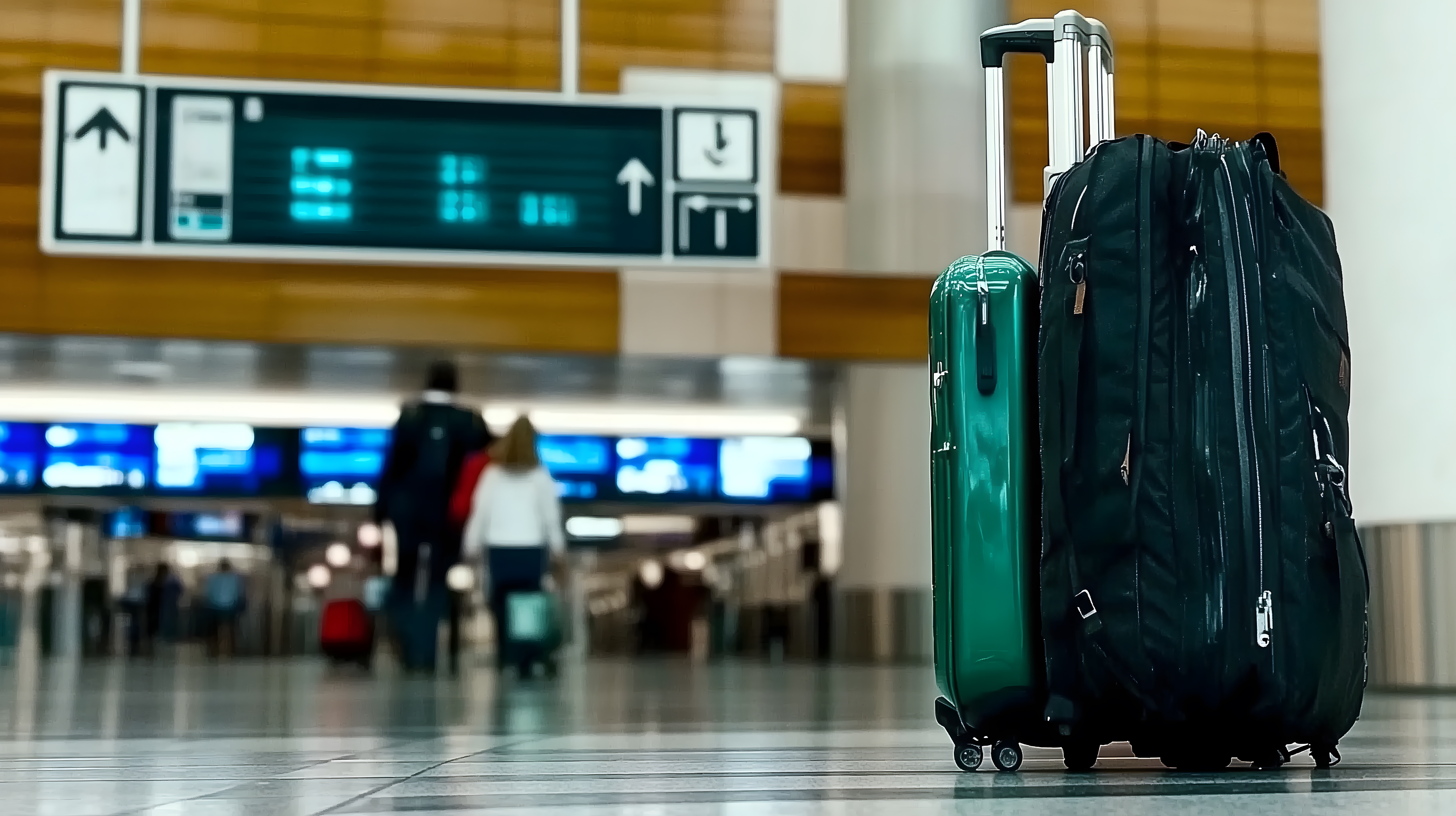 Dieses Bild zeigt einen modernen Flughafenterminal mit Gepäckstücken, die zur Abreise bereitstehen. Im Vordergrund sind zwei Koffer zu sehen, einer in kräftigem Grün und einer in Schwarz. Im Hintergrund ist eine Anzeigetafel mit Flug- und Abfluginformationen zu erkennen, was die Reisesituation verdeutlicht. Das Bild strahlt eine ruhige, geordnete Atmosphäre aus und eignet sich hervorragend für den Einsatz in Blogs, Newslettern, Social-Media-Beiträgen oder Werbematerialien rund um das Thema Reisen, Urlaub und Mobilität. Als kostenloses Stockfoto in hoher Auflösung unter der Creative-Commons-Lizenz können Gestalter und Kreative das Bild frei und flexibel in ihren Projekten verwenden.