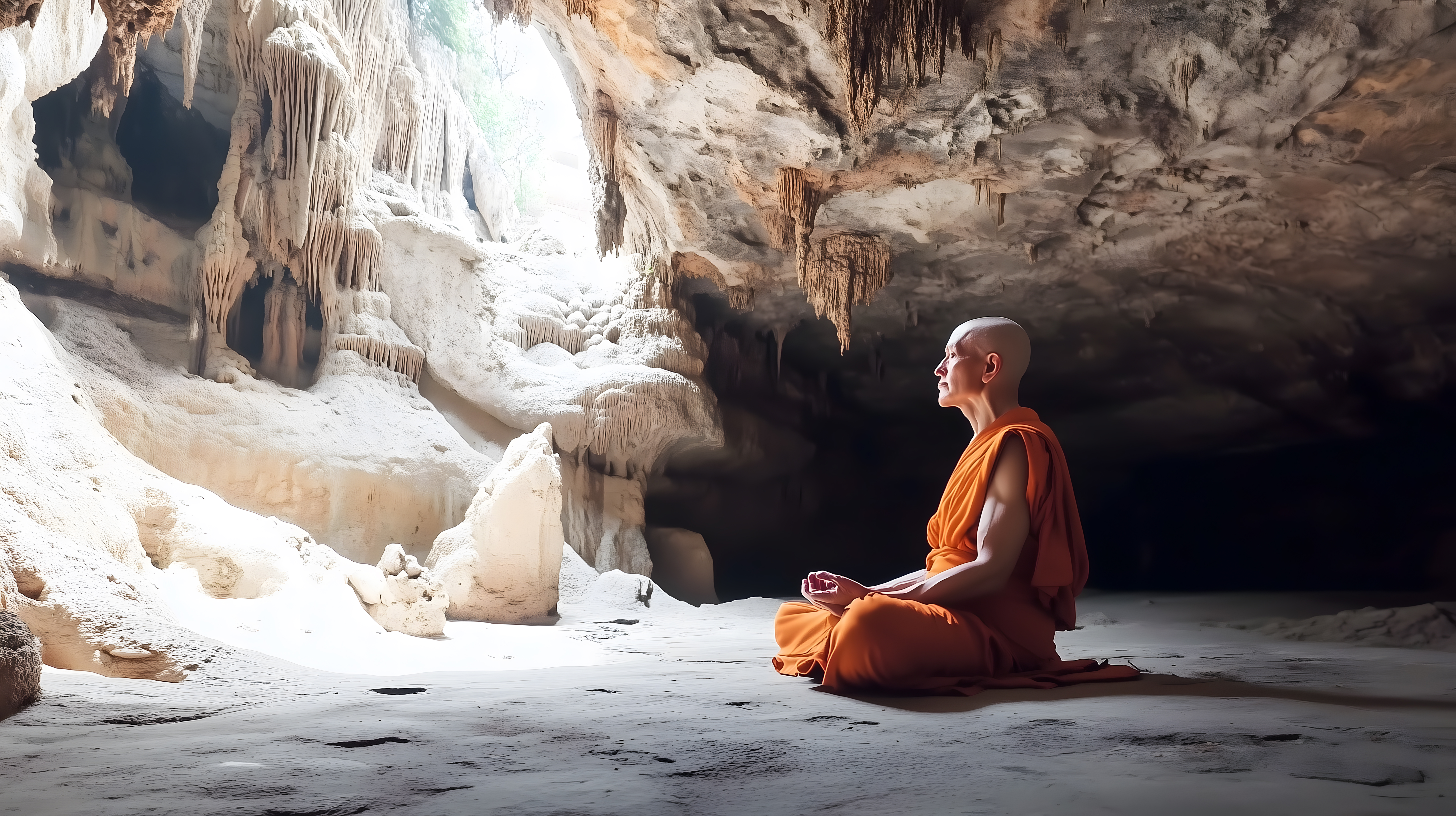 Dieses beeindruckende Foto zeigt einen buddhistischen Mönch, der tief in Meditation versunken ist. Er sitzt in einer riesigen Höhle, umgeben von mächtigen Felsformationen und Stalaktiten, die sich von der Decke herabwinden. Das Licht fällt sanft in den Raum und erzeugt eine mystische, fast sakrale Atmosphäre. Das Bild vermittelt eine tiefe Ruhe und Konzentration, die den Betrachter in den Bann zieht. Dieses kostenlose Stockfoto in hoher Auflösung unter Creative-Commons-Lizenz eignet sich hervorragend für Blogbeiträge, Social-Media-Posts oder Werbematerialien rund um Themen wie Buddhismus, Meditation, Spiritualität oder Naturerlebnisse.