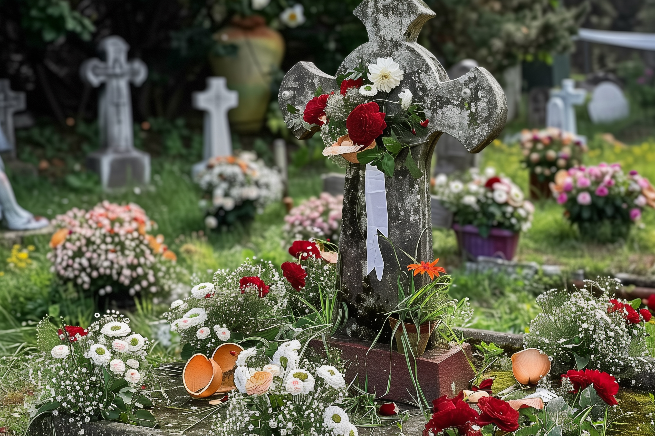 Das Bild zeigt einen Grabstein auf einem Friedhof, geschmückt mit einem Blumenstrauß und anderen Dekorationselementen. Der Grabstein ist mit einem Kreuz und Moos bewachsen, was eine feierliche und ruhige Atmosphäre vermittelt. Die Blumen, darunter rote Rosen und weiße Gänseblümchen, sind liebevoll auf dem Grab arrangiert und verleihen dem Motiv einen emotionalen Ausdruck der Trauer und des Gedenkens. Das Foto eignet sich gut für die Verwendung in Blogs, Newslettern oder Werbung im Bereich Bestattung, Trauer und Gedenken. Als kostenloses Stockfoto in hoher Auflösung und unter Creative-Commons-Lizenz kann es vielseitig eingesetzt werden.