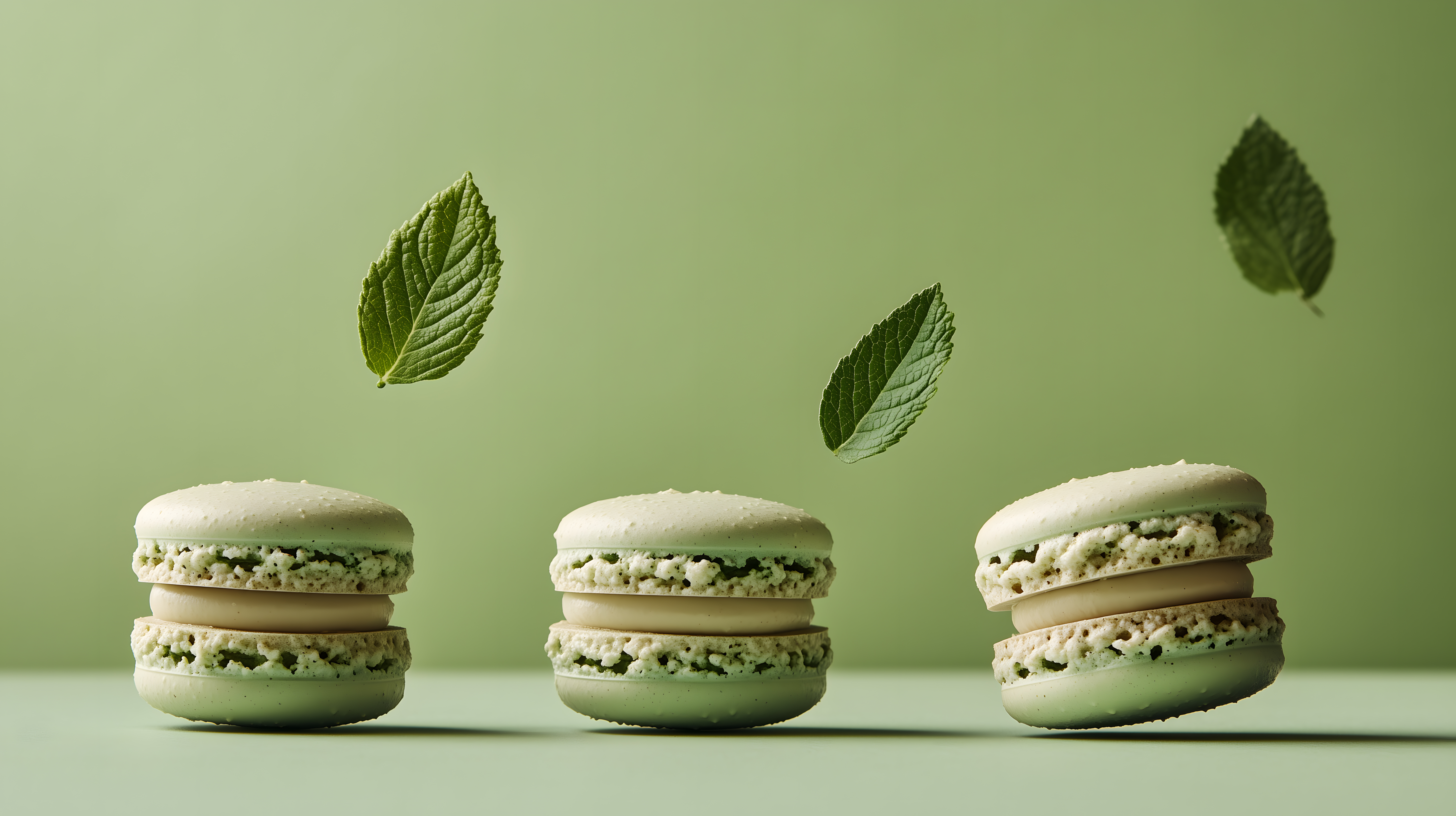 Dieses Bild zeigt drei appetitlich aussehende grüne Macarons mit Minzblättern, die vor einem einfarbigen hellgrünen Hintergrund platziert sind. Die Macarons sind sorgfältig angeordnet und werfen einen leichten Schatten, was dem Bild eine minimalistisch-moderne Ästhetik verleiht. Diese Aufnahme eignet sich hervorragend für die Verwendung in Blogs, Newslettern, Social-Media-Beiträgen oder Werbematerialien rund um Desserts, Backwaren und Lebensmittel. Als kostenloses Stockfoto in hoher Auflösung und unter einer Creative-Commons-Lizenz bietet es Kreativen viele Möglichkeiten zur Gestaltung ansprechender Inhalte.
