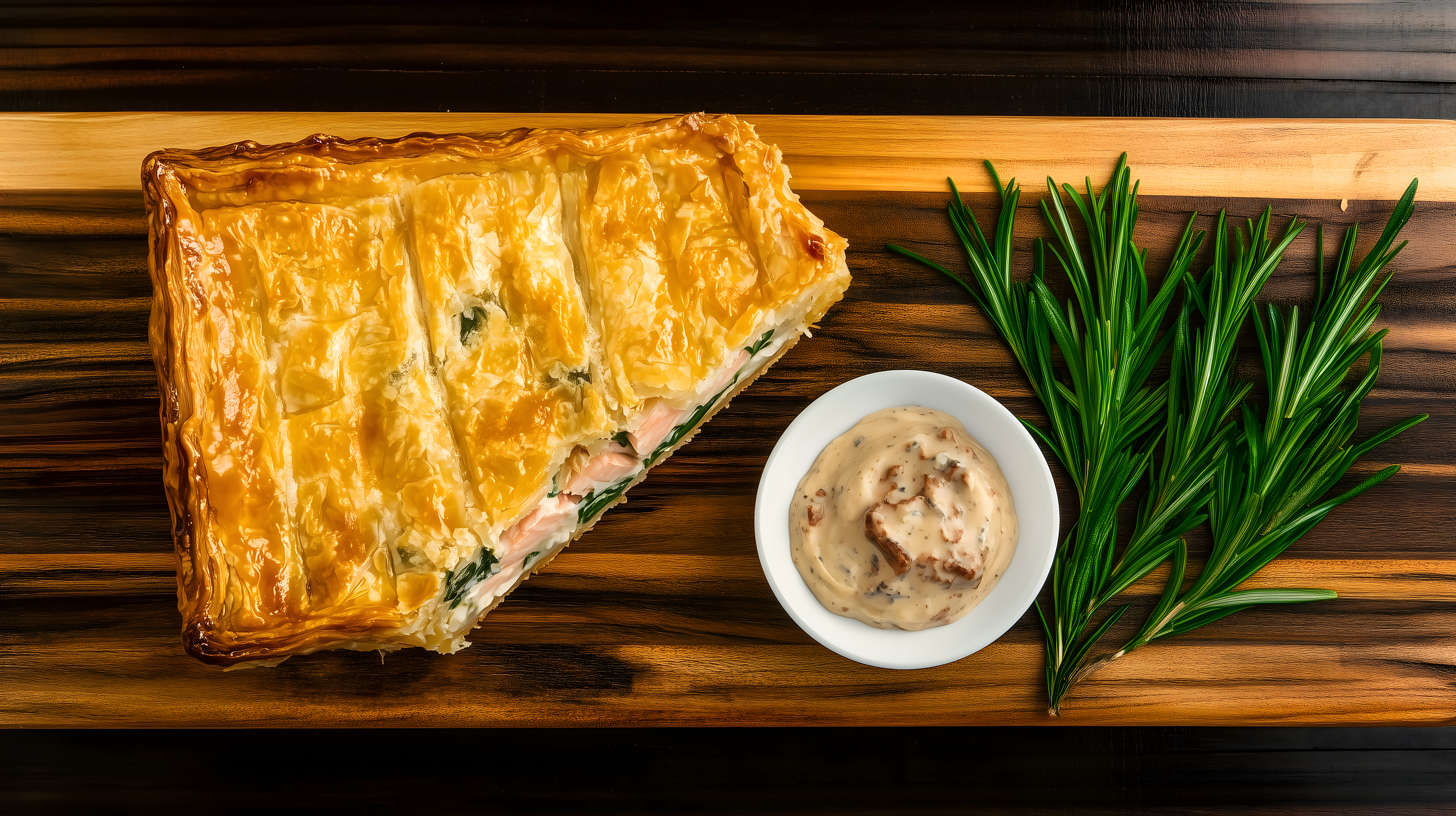 Dieses hochwertige Stockfoto zeigt eine appetitlich angerichtete Lachsblätterteigpastete, serviert mit einer cremigen Dillsauce und frischen Rosmarinzweigen auf einem rustikalen Holzbrett. Die goldbraune Blätterteighülle umschließt das saftige Lachsfleisch, während die grünen Rosmarinblätter einen frischen Kontrast bilden. Die Fotografie besticht durch ihre sorgfältige Komposition, die lebendigen Farben und den stilvollen, natürlichen Charakter. Dieses Bild eignet sich hervorragend für den Einsatz in Kochblogs, Restaurantwebsites, Foodmagazinen oder Werbekampagnen für hochwertige Lebensmittel. Als kostenloses, hochauflösendes Stockfoto unter einer Creative-Commons-Lizenz steht es allen Interessierten für vielfältige Nutzungen zur Verfügung.