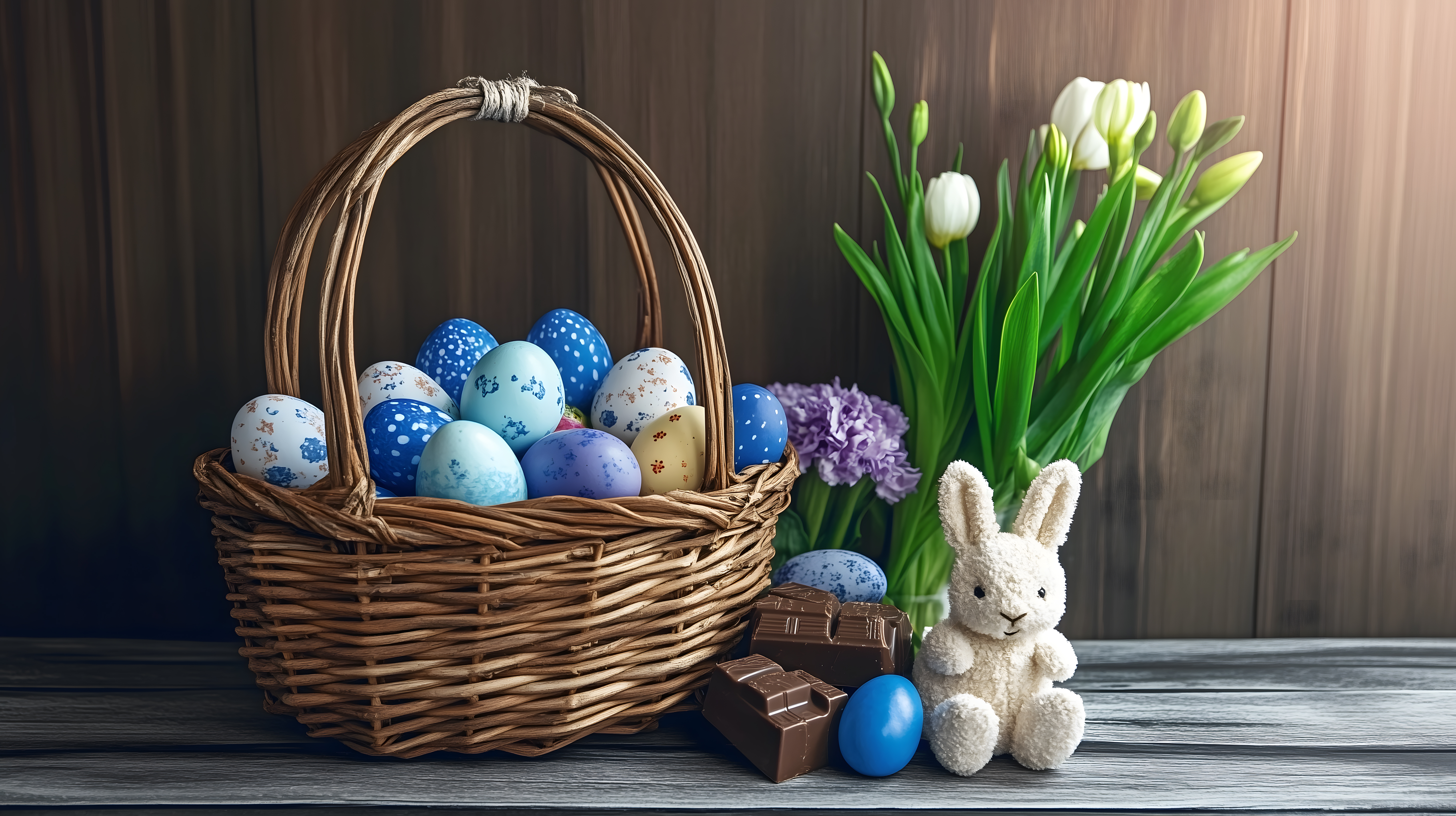 Dieses Foto zeigt ein stimmungsvolles Osterstilleben. Im Vordergrund befindet sich ein geflochtener Korb, der mit bunten Ostereien in Blau, Weiß und Tupfendekor gefüllt ist. Daneben liegt etwas Schokolade und ein kuschelig wirkender Osterhase. Im Hintergrund sind weiße Tulpen und eine lila Hyazinthe zu sehen, die dem Arrangement eine frühlingshaft-festliche Note verleihen. Das Bild besticht durch die sorgfältige Komposition und die warmen Farbtöne, die eine einladende und gemütliche Atmosphäre schaffen. Dieses hochauflösende Foto eignet sich ideal für die Verwendung in Blogbeiträgen, Newslettern oder Werbematerialien rund um das Osterfest und kann unter den Bedingungen der Creative Commons-Lizenz kostenfrei genutzt werden.