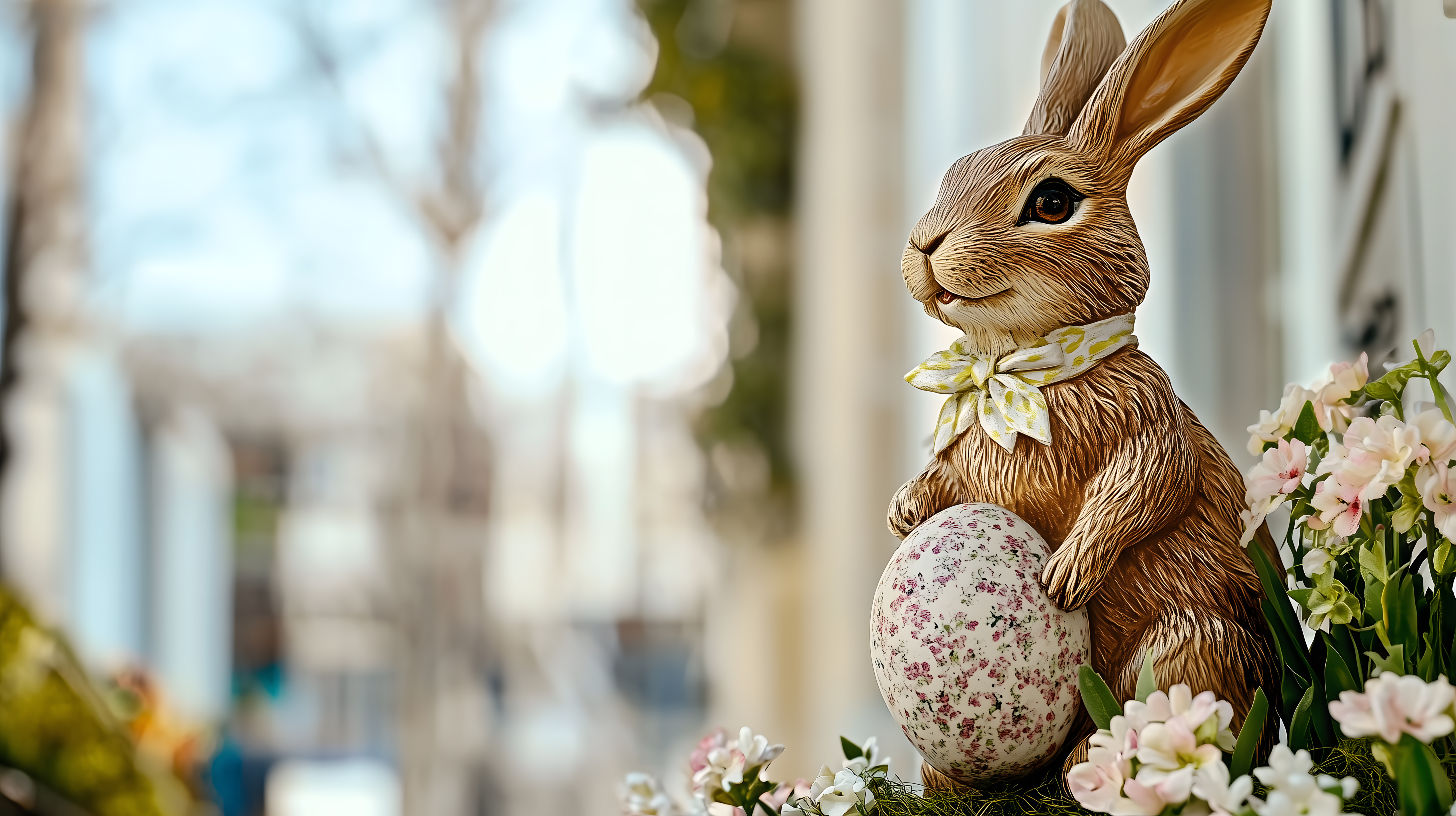 Dieses stimmungsvolle Foto zeigt einen detaillierten, hölzernen Osterhasen vor einem unscharfen, natürlichen Hintergrund. Der Hase trägt eine gelbe Schleife und hält ein bunt bemaltes Osterei in den Pfoten. Umgeben ist er von zarten Frühlingsblumen in Rosa und Weiß, die die saisonale Atmosphäre unterstreichen. Das Foto strahlt eine heitere, frische und dekorative Osterstimmung aus und eignet sich hervorragend für Oster-Themen in Blogs, Newslettern, Social-Media-Posts oder Werbematerialien. Es handelt sich um ein kostenloses Stockfoto in hoher Auflösung, das unter einer Creative-Commons-Lizenz veröffentlicht wurde.