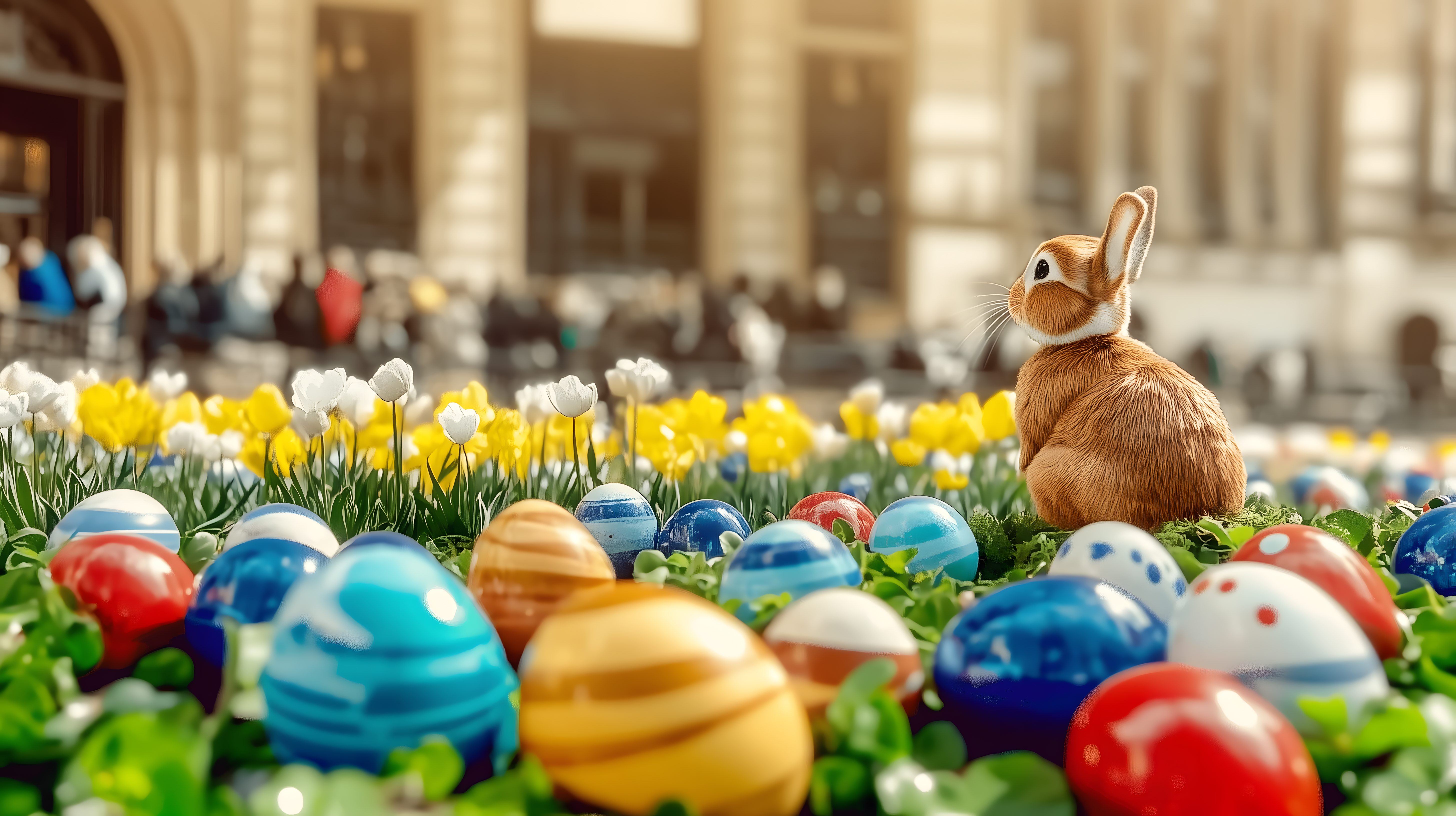 Dieses stimmungsvolle Foto zeigt eine farbenfrohe Osterszene mitten in der Stadt. Im Vordergrund sehen wir einen Hasen umgeben von bunten, bemalten Eiern auf einer grünen Wiese. Im Hintergrund sind weiße und gelbe Tulpen zu sehen, die den frühlingshaften Charakter der Szene unterstreichen. Der Kontrast zwischen dem städtischen Umfeld und der naturnahen Dekoration schafft ein charmantes, saisonales Bild. Das Foto eignet sich hervorragend für Einsätze in Blogs, Newslettern oder Werbematerialien rund um das Thema Ostern. Es ist in hoher Auflösung und unter einer Creative-Commons-Lizenz verfügbar.
