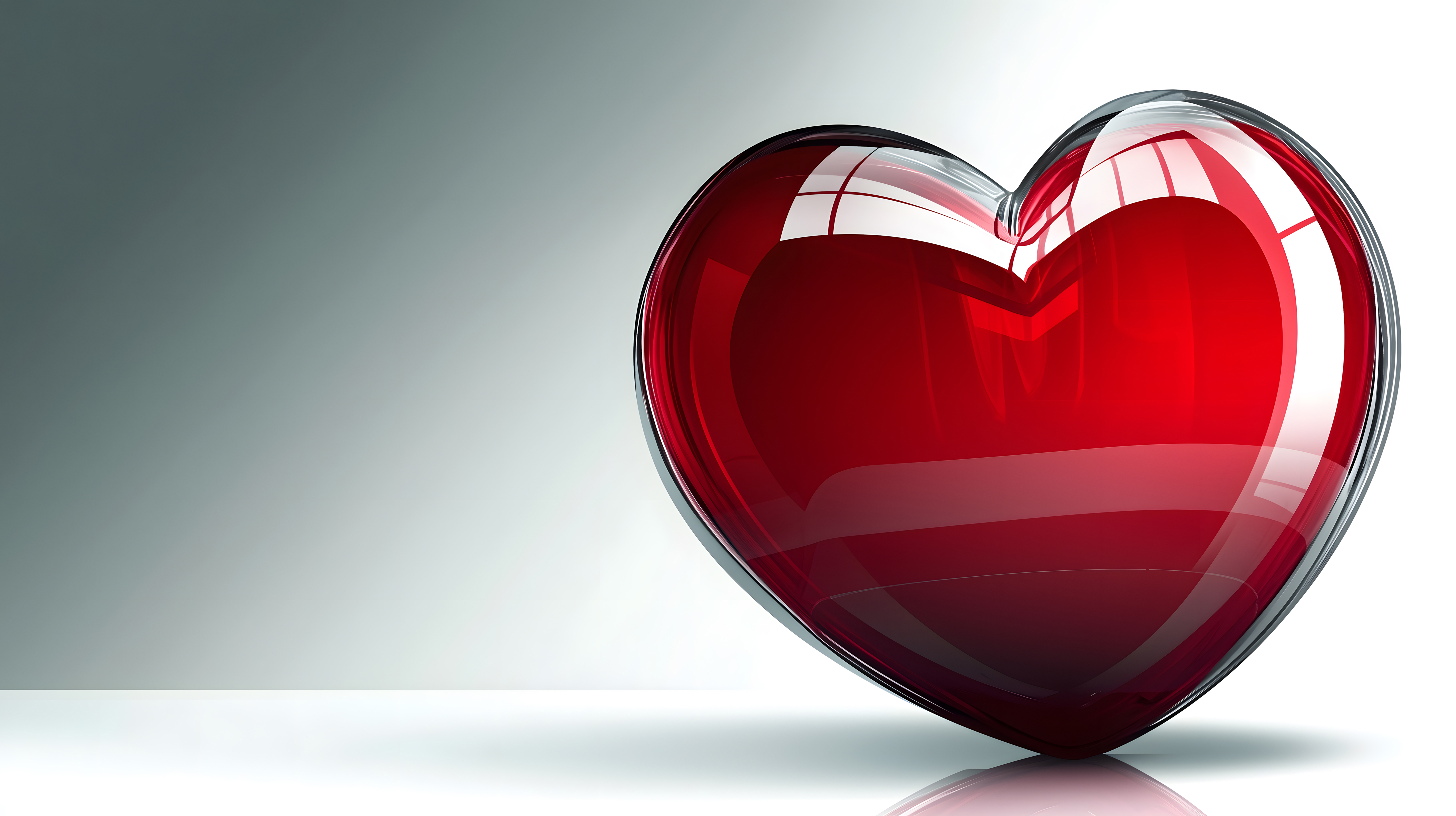 Das Bild zeigt ein modern anmutendes, rotglänzendes Herz mit einem eleganten Glaseffekt. Das Herz schwebt vor einem neutral-grauen Hintergrund und zieht den Blick des Betrachters sofort auf sich. Die glänzende, glatte Oberfläche des Herzens erzeugt einen hochwertig-edlen Eindruck und verleiht dem Motiv einen symbolischen, konzeptuellen Charakter.