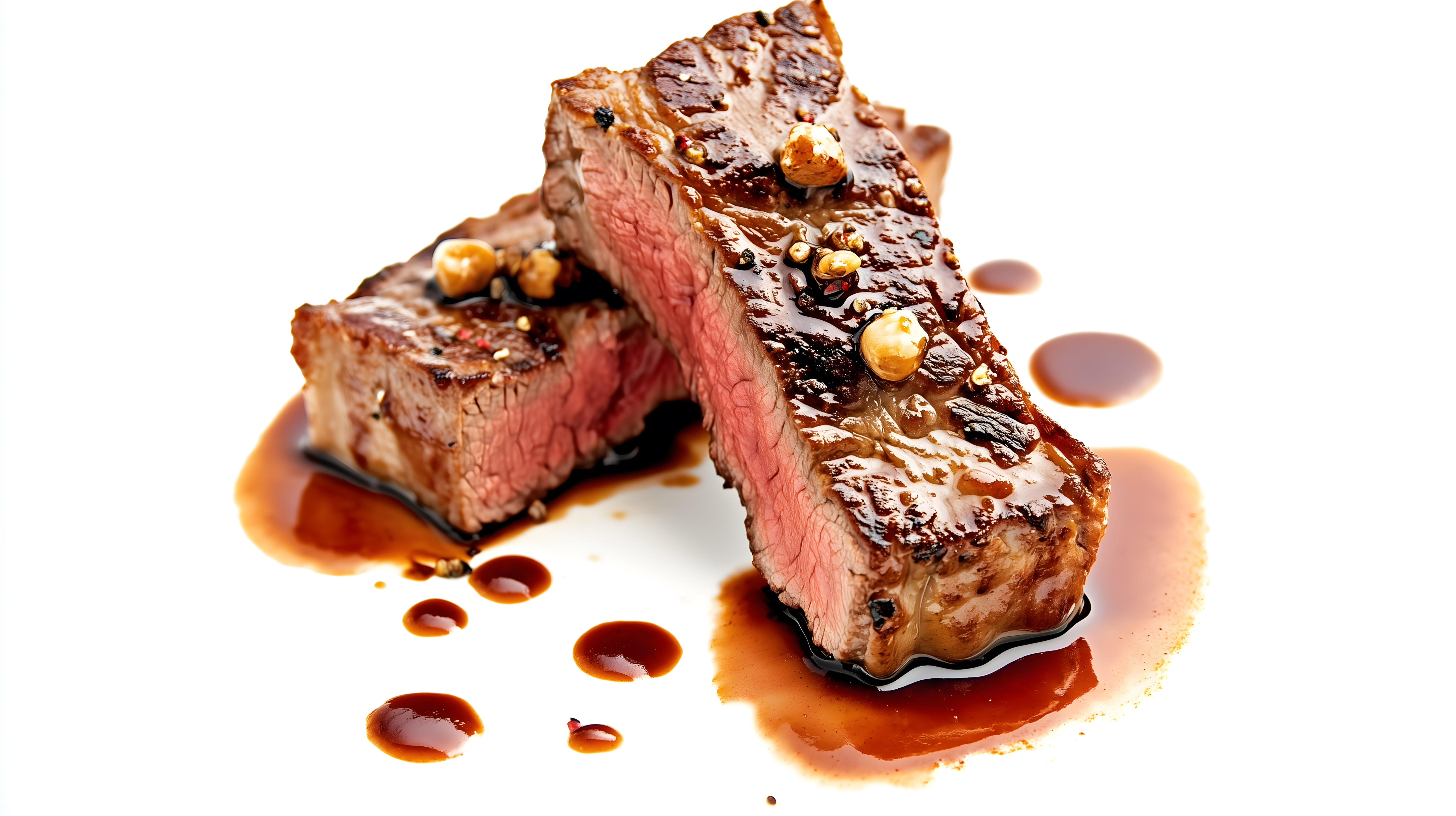 Das Bild zeigt mehrere saftige, rosa gegarte Rindersteakscheiben, die auf einem weißen Untergrund präsentiert werden. Die Scheiben sind mit einer üppigen, roten Soße beträufelt, die sich in kleinen Pfützen um das Fleisch ansammelt. Das Bild vermittelt einen hochwertigen, eleganten Eindruck, der für die Verwendung in kulinarischen Publikationen, Werbekampagnen oder Foodblogs geeignet wäre. Dieses hochauflösende Stockfoto ist unter einer Creative-Commons-Lizenz verfügbar und kann kostenlos für verschiedene Zwecke genutzt werden.