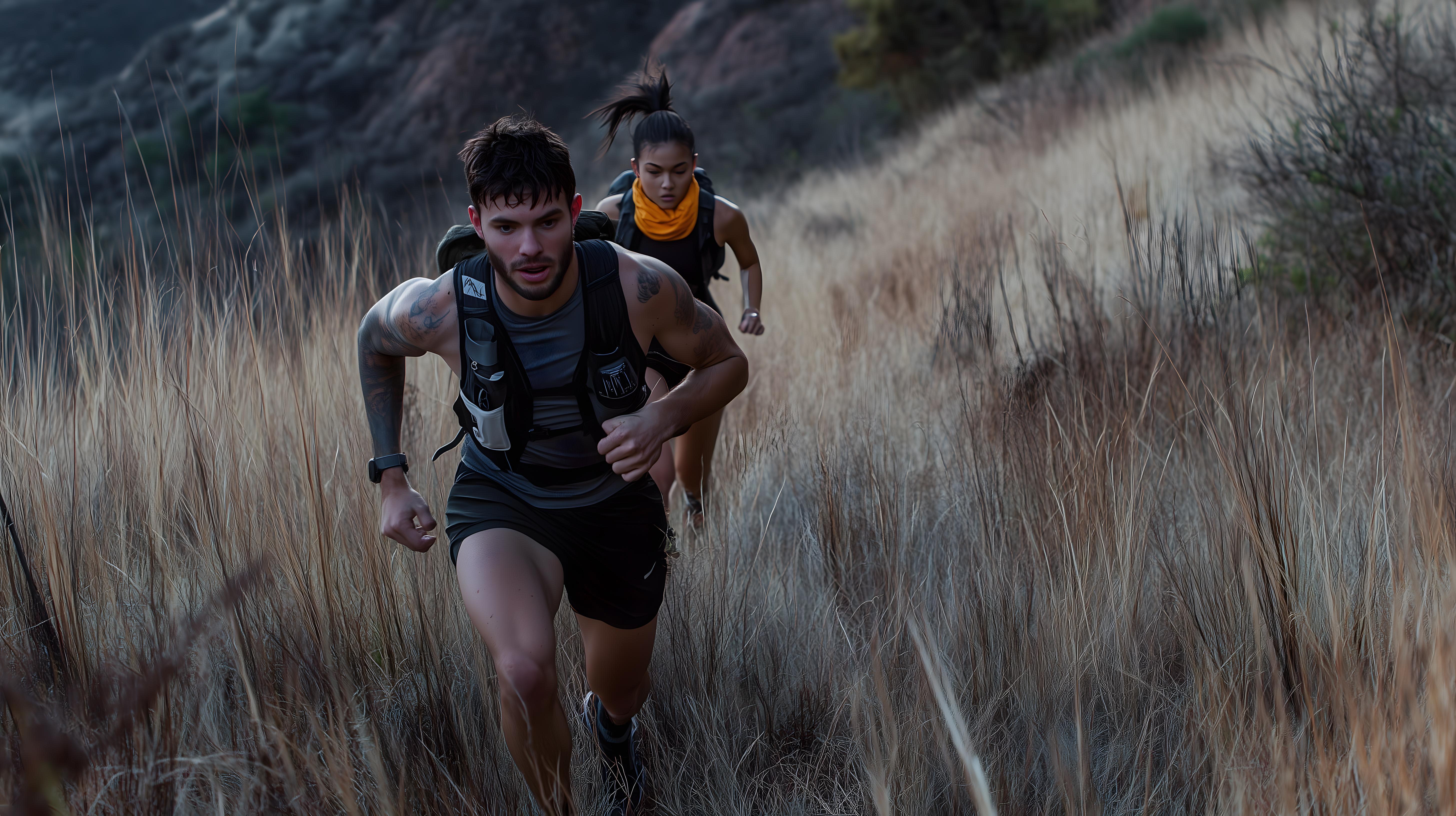 Dieses fesselnde Foto zeigt ein Paar von Läufern, die sich auf einem schmalen Trail durch eine beeindruckende Berglandschaft bewegen. Der Mann läuft entschlossen voran, während die Frau hinter ihm folgt, beide mit fokussiertem Blick und entschlossenem Ausdruck. Die kräftigen Farben, das raue Gras und die Felsen im Hintergrund verleihen der Szene eine natürliche, abenteuerliche Atmosphäre. Dieses Bild eignet sich hervorragend für Blog-Beiträge, Newsletter-Illustrationen oder Social-Media-Postings zum Thema Ausdauersport, Motivation und ein aktiver, gesunder Lebensstil. Als hochauflösendes Stockfoto unter einer Creative-Commons-Lizenz ist es für eine Vielzahl von Zwecken frei nutzbar.