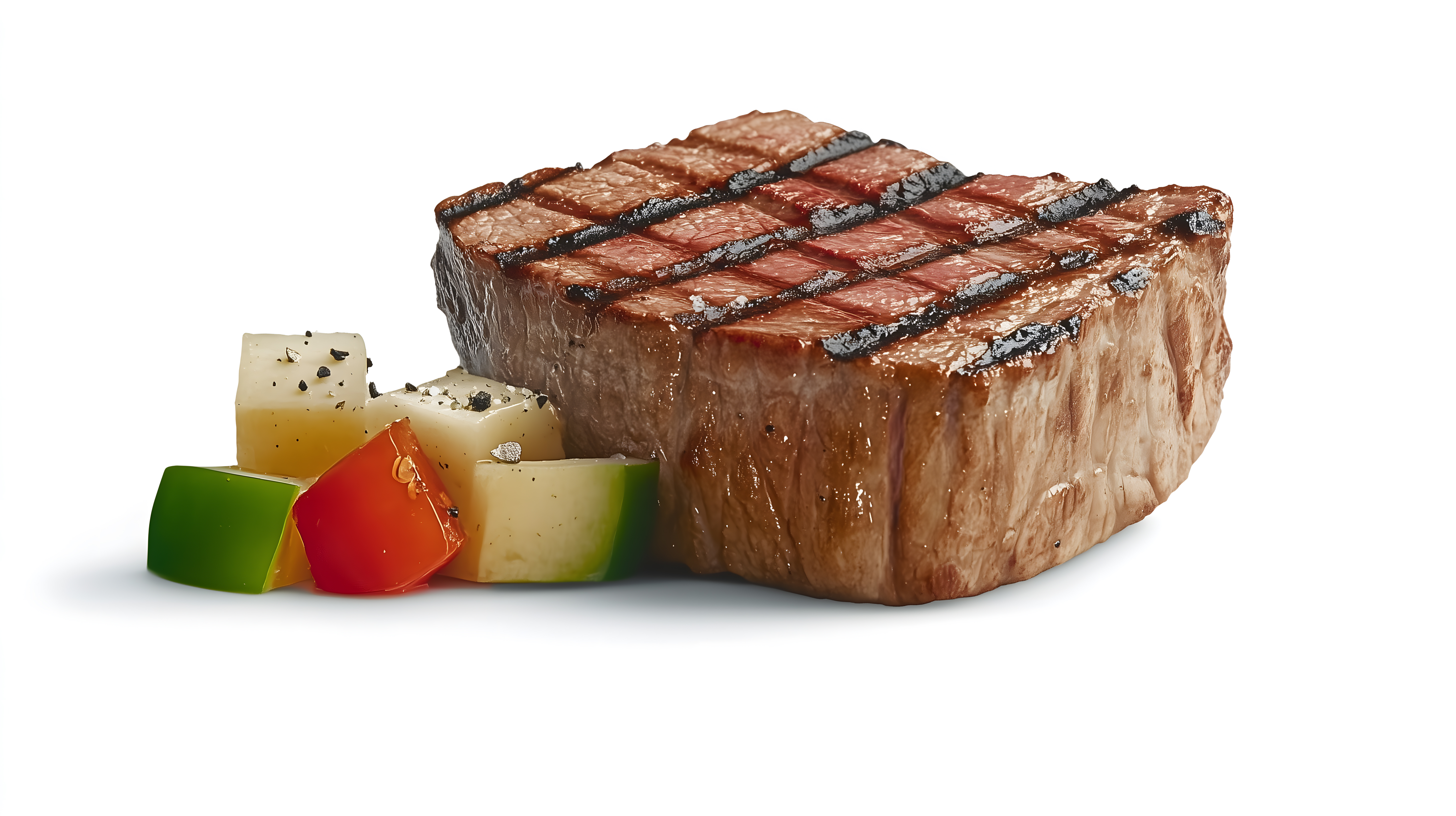 Dieses realistische Foto zeigt ein saftiges, gegrill tes Rindersteak mit würziger Oberfläche. Das Fleisch ist umgeben von frischen Gemüsewürfeln in leuchtenden Farben - Tomaten, Paprika und Käsestücken. Die Komposition und Beleuchtung verleihen dem Bild eine appetitliche Ausstrahlung, die es ideal für kulinarische Beiträge in Blogs, Magazinen oder Werbemedien macht. Als hochaufgelöstes Stockfoto unter Creative-Commons-Lizenz steht es für vielfältige Nutzungsmöglichkeiten zur Verfügung.