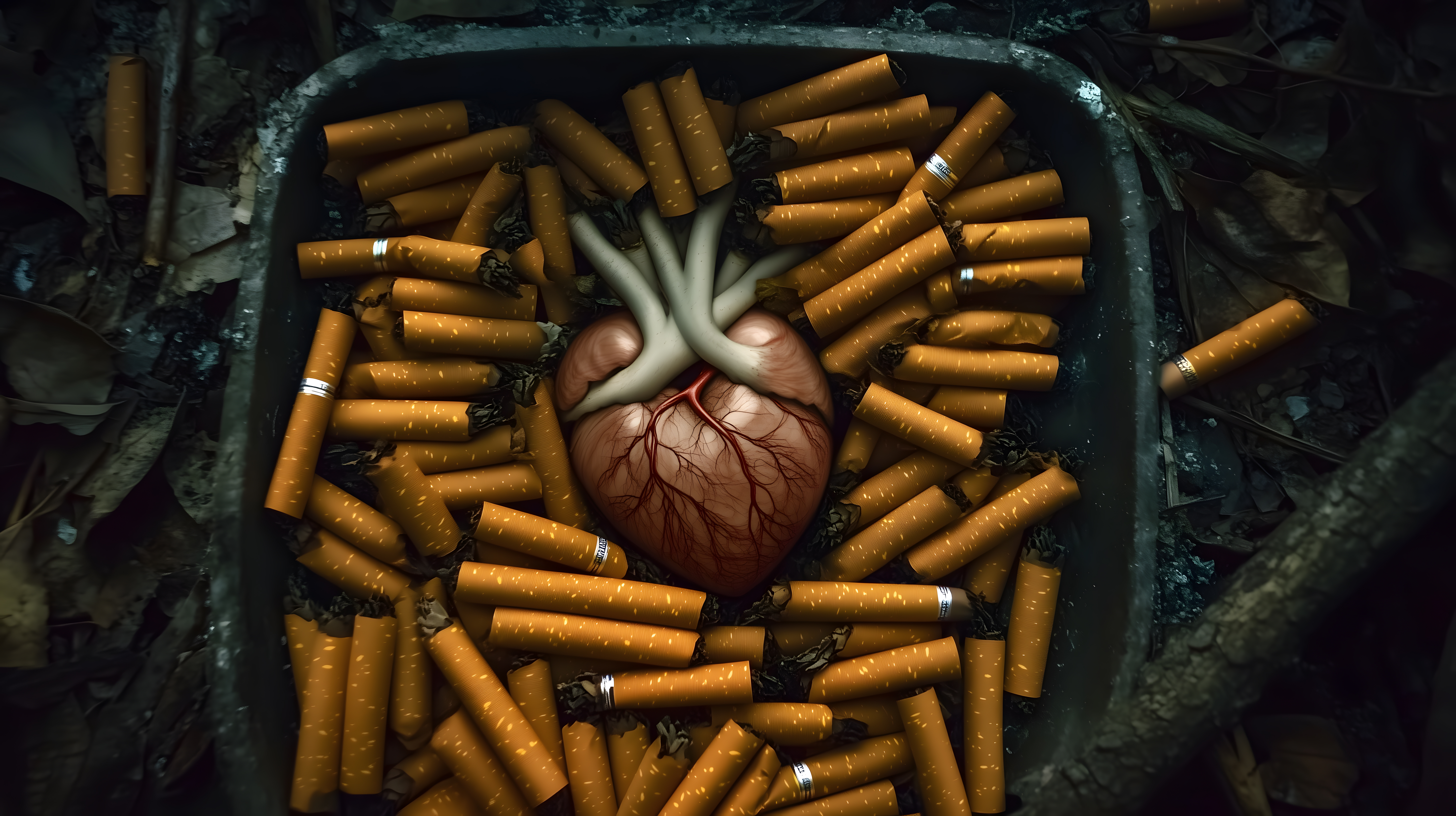 Das Foto zeigt ein menschliches Herz, das von einer Vielzahl an Zigarettenstummeln umgeben ist, die in einer dunklen Schale angeordnet sind. Die düstere und kontraststarke Bildkomposition symbolisiert die schädlichen Auswirkungen des Rauchens auf die Gesundheit des Herzens. Diese starke Visualisierung eignet sich hervorragend als Konzeptfoto für Kampagnen, Berichte oder Artikel zum Thema Rauchen, Suchtprävention und Herz-Kreislauf-Erkrankungen. Das hochauflösende Stockfoto steht unter einer Creative-Commons-Lizenz zur Verfügung und kann für verschiedenste Zwecke genutzt werden, sei es in Onlinemedien, Printpublikationen oder Werbematerialien.