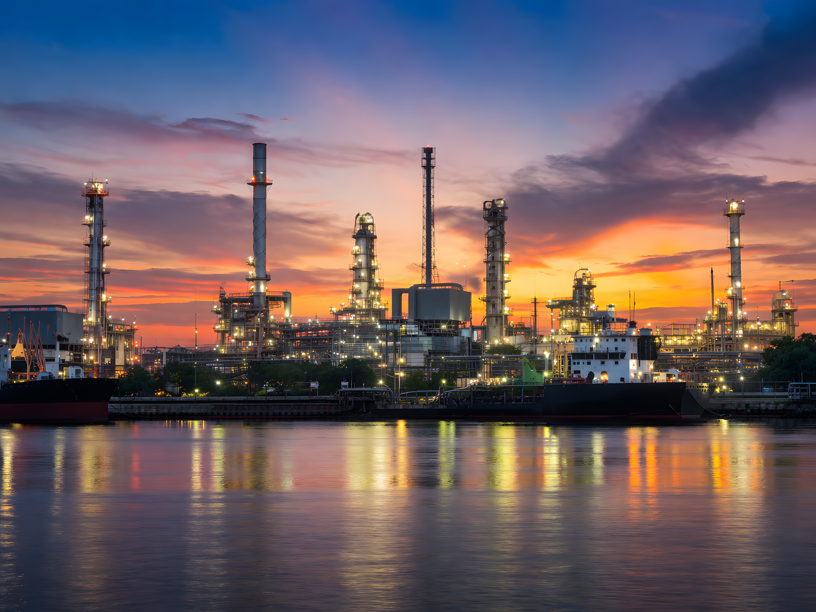 Dieses beeindruckende Foto zeigt eine riesige Industrieanlage - eine petrochemische Raffinerie - am Ufer eines Gewässers. Die Fabrikgebäude und Türme zeichnen sich in der Abenddämmerung deutlich vor einem romantischen Sonnenuntergangshimmel ab. Das Farbspiel aus orangen und violetten Tönen verleiht der Szenerie eine fast schon mystische Stimmung. Die perfekte Spiegelung der Anlage in der ruhigen Wasseroberfläche verstärkt den dramatischen Eindruck.