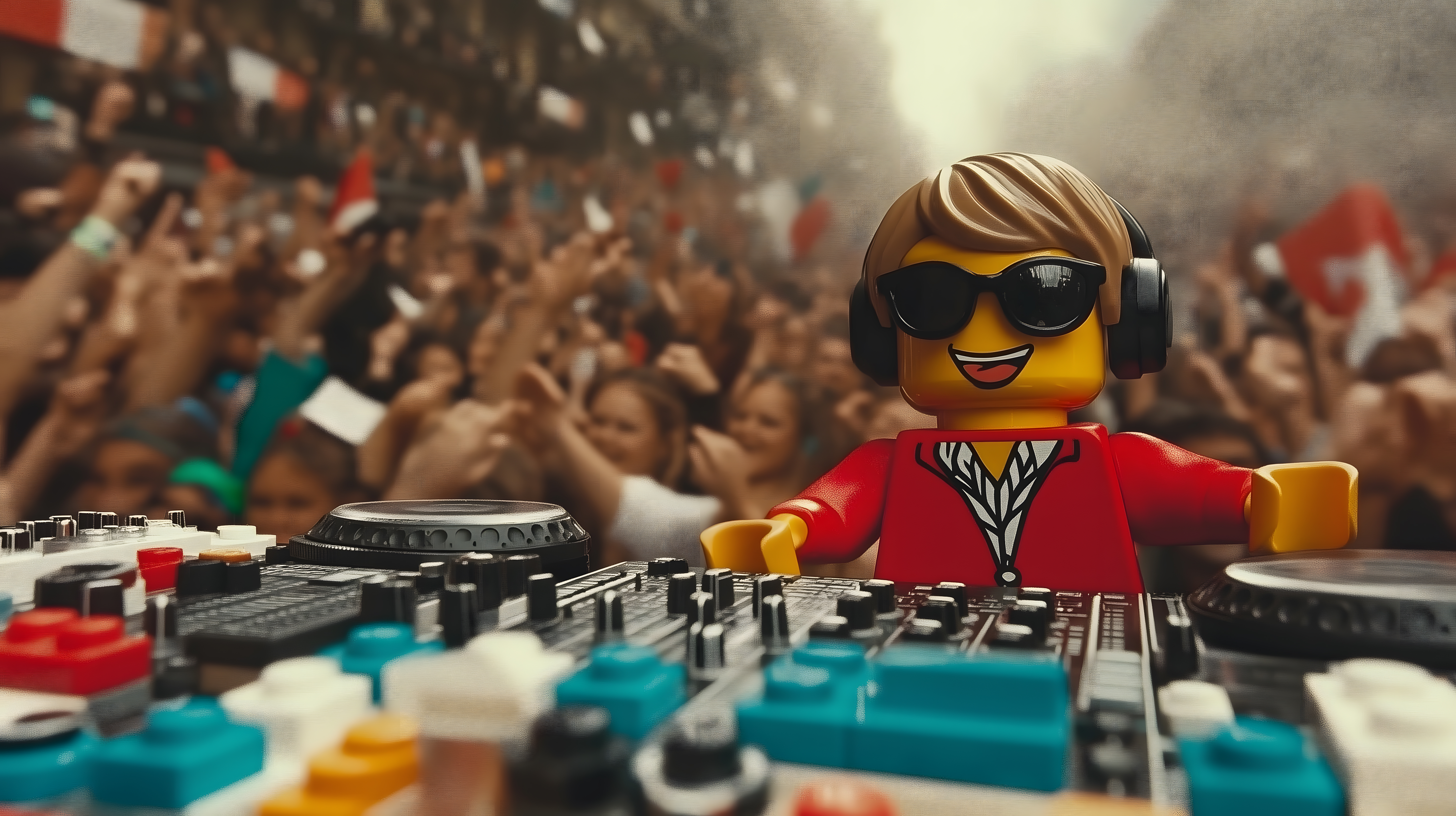 Das Bild zeigt eine Lego-Figur, die als DJ auf einer Partybühne auftritt. Die kleine Plastikfigur ist in rot gekleidet, trägt Kopfhörer und eine Sonnenbrille und steht hinter einem komplexen Mischpult voller Regler und Knöpfe. Im Hintergrund ist eine Menschenmenge zu sehen, die offenbar feiern und tanzen. Die Szene vermittelt eine lebendige, energiegeladene Stimmung und kann als Stockfoto für verschiedene Anwendungen wie Blogbeiträge, Social-Media-Posts oder Werbekampagnen rund um Musik, Unterhaltung und Partys genutzt werden. Das hochauflösende Foto ist unter einer Creative-Commons-Lizenz frei verwendbar.