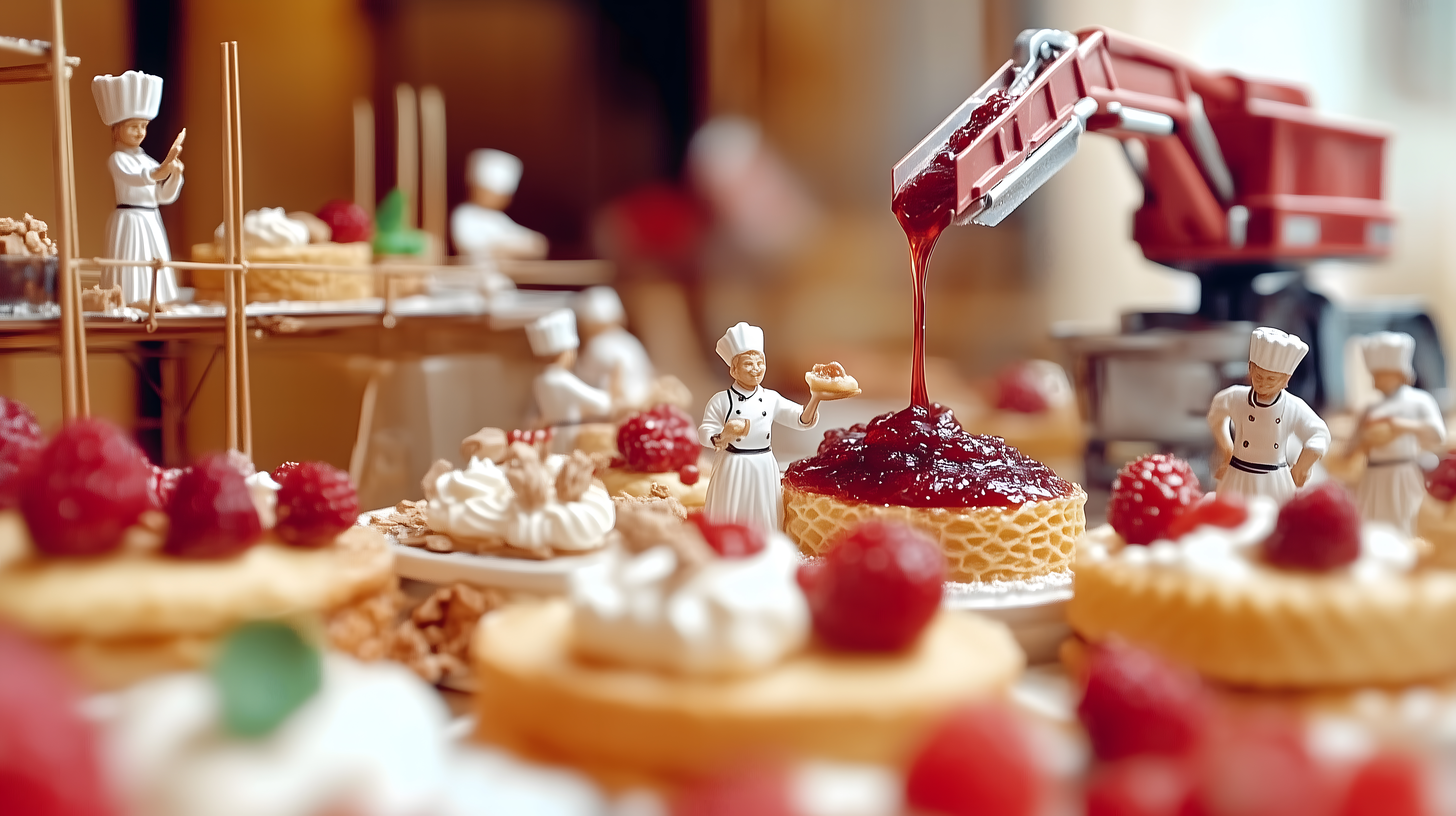 Dieses detailreiche Foto zeigt eine Miniaturwelt voller süßer Köstlichkeiten. Im Zentrum steht eine Torte, auf der ein Konditor in Miniaturform gerade einen roten Zuckerguss auflegt. Umgeben ist die Szenerie von weiteren Torten, Cupcakes und anderen Leckereien, alles in satten Rot- und Gelbtönen. Die Miniatur-Köche in ihren weißen Uniformen wirken, als würden sie die Torten dekorieren. Das Bild vermittelt eine stimmungsvolle, fast märchenhafte Atmosphäre einer Backstube voller süßer Kreationen. Es eignet sich hervorragend als kostenloses Stockfoto für Blogbeiträge, Social-Media-Kanäle oder Werbematerialien rund um Lebensmittel, Kochen und Konditorei in hoher Auflösung und unter Creative-Commons-Lizenz.
