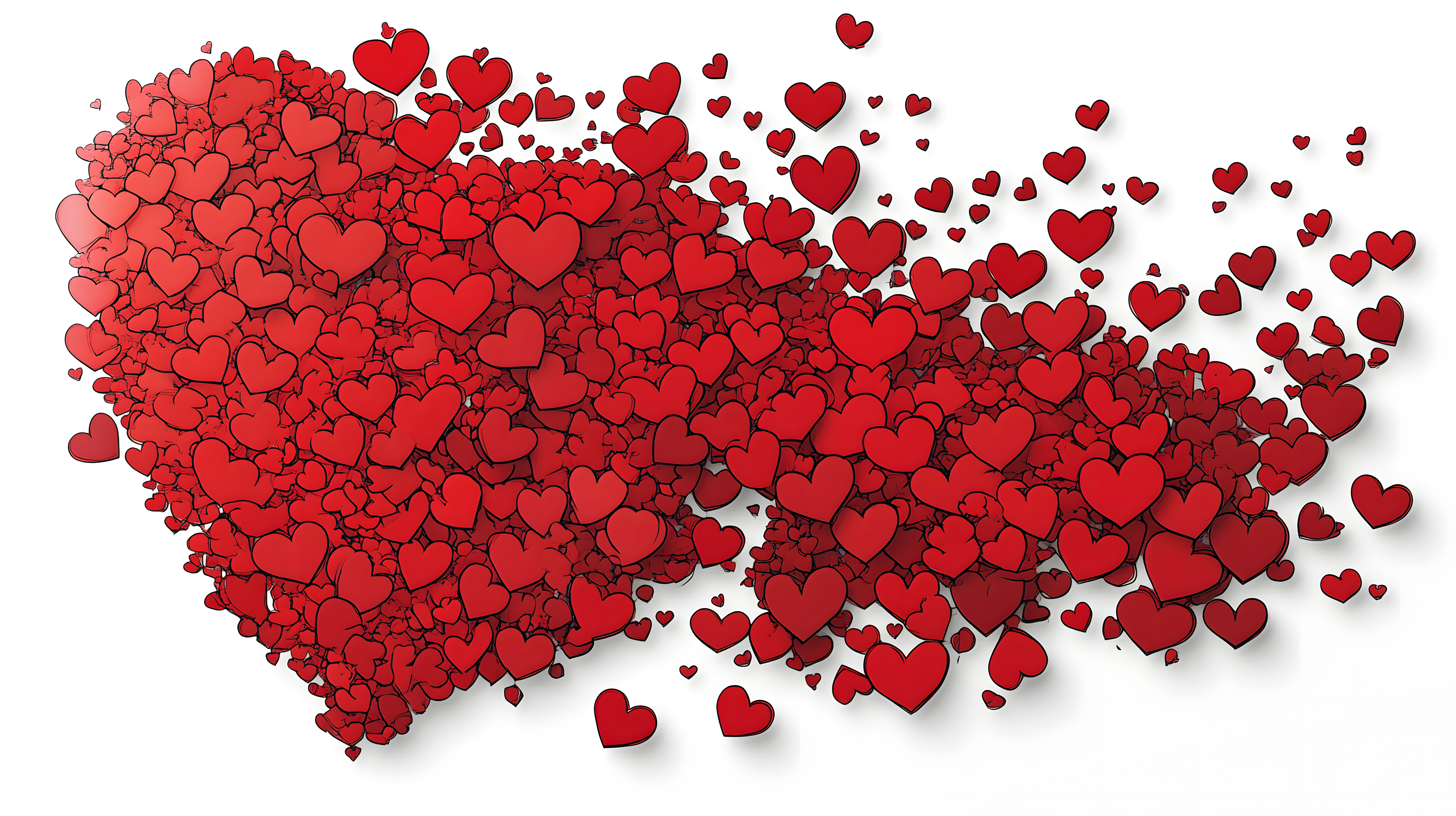 Dieses Stockfoto zeigt eine Ansammlung von roten Herzen, die eine größere Herzform bilden. Die Herzen sind unterschiedlich groß und überlagern sich teils, sodass ein abstraktes, fast grafisches Muster entsteht. Die Anordnung der Herzen verleiht dem Bild eine dynamische, fließende Ästhetik. Die kräftige rote Farbe sticht hervor und verleiht dem Motiv eine emotionale, leidenschaftliche Ausstrahlung.