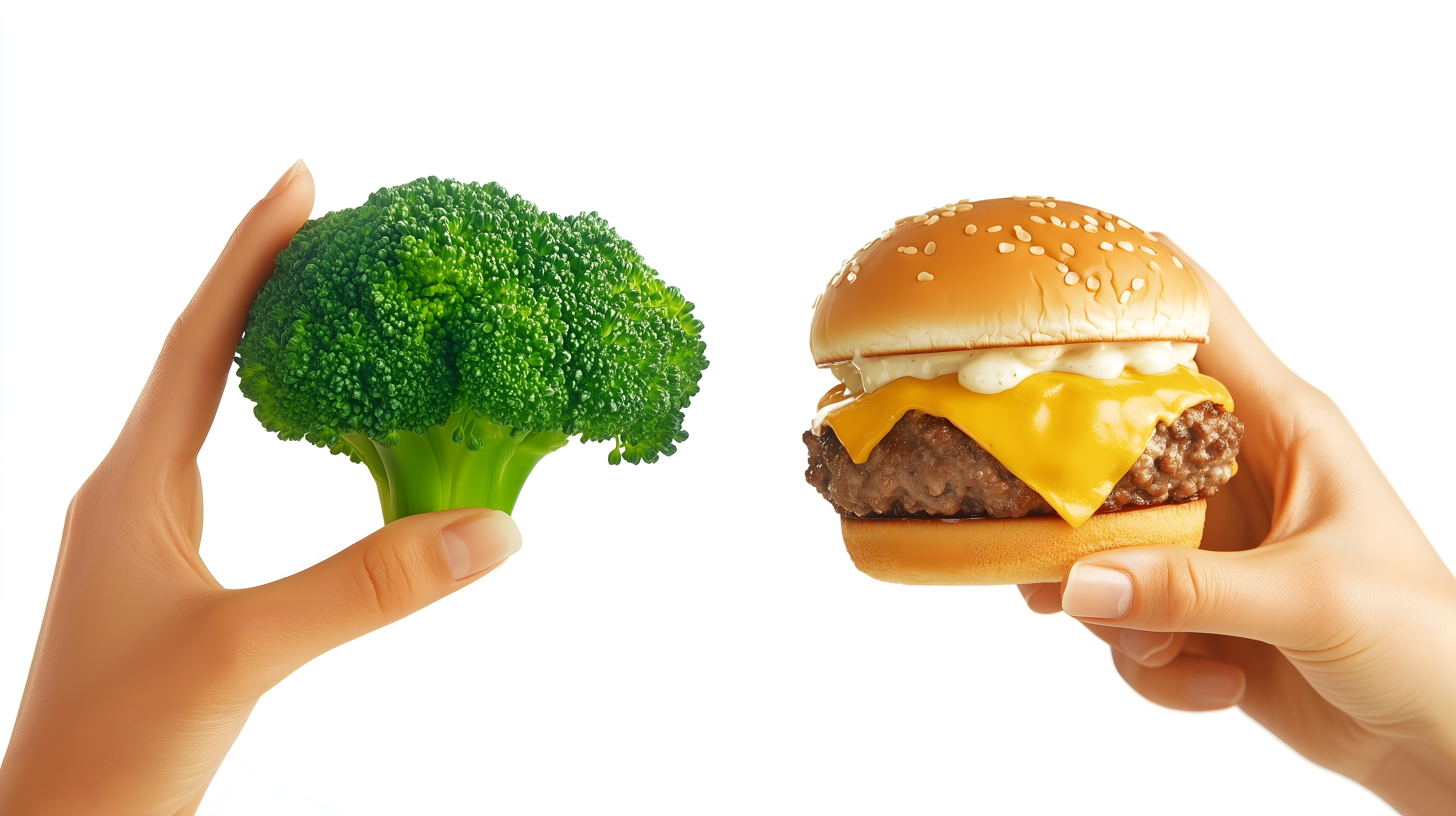 Das Bild zeigt einen kontrastreichen Vergleich zwischen einem frischen, grünen Brokkoli-Strauß und einem appetitlich aussehenden Burger in den Händen. Die Darstellung spiegelt den Konflikt zwischen einer gesunden und einer ungesunden Ernährungsweise wider und fordert den Betrachter auf, eine Entscheidung zu treffen. Das Foto eignet sich hervorragend für Blogbeiträge, Social-Media-Posts oder Werbekampagnen rund um Gesundheit, Ernährung und den Work-Life-Balance-Diskurs. Als kostenloses Stockfoto in hoher Auflösung und unter einer Creative-Commons-Lizenz kann es vielfältig eingesetzt werden.