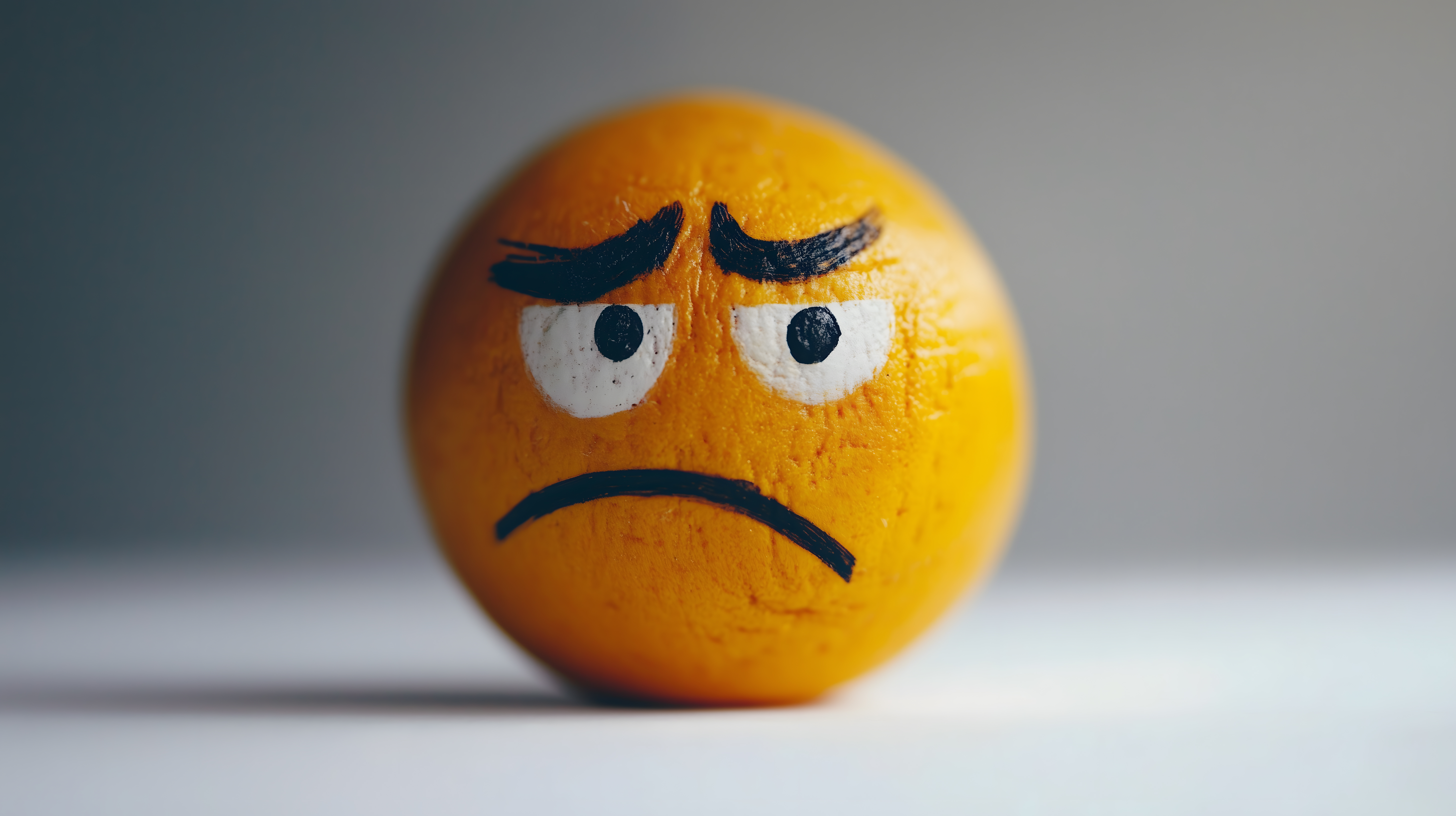 Dieses Bild zeigt eine kreative Illustration eines frustrierten Zitrus-Emoticons. Der Zitrusfrüchte-Smiley hat einen verärgerten Gesichtsausdruck mit zusammengezogenen Augenbrauen und einem abwärts gerichteten Mundwinkel, der Verwirrtheit und Frust vermittelt. Die Illustration ist in einer minimalistischen, handgemalt wirkenden Strichführung gestaltet und verwendet kräftige Gelbtöne sowie dezente Schwarz- und Weißakzente, um den Emotionsausdruck des Emoticons zu unterstreichen.