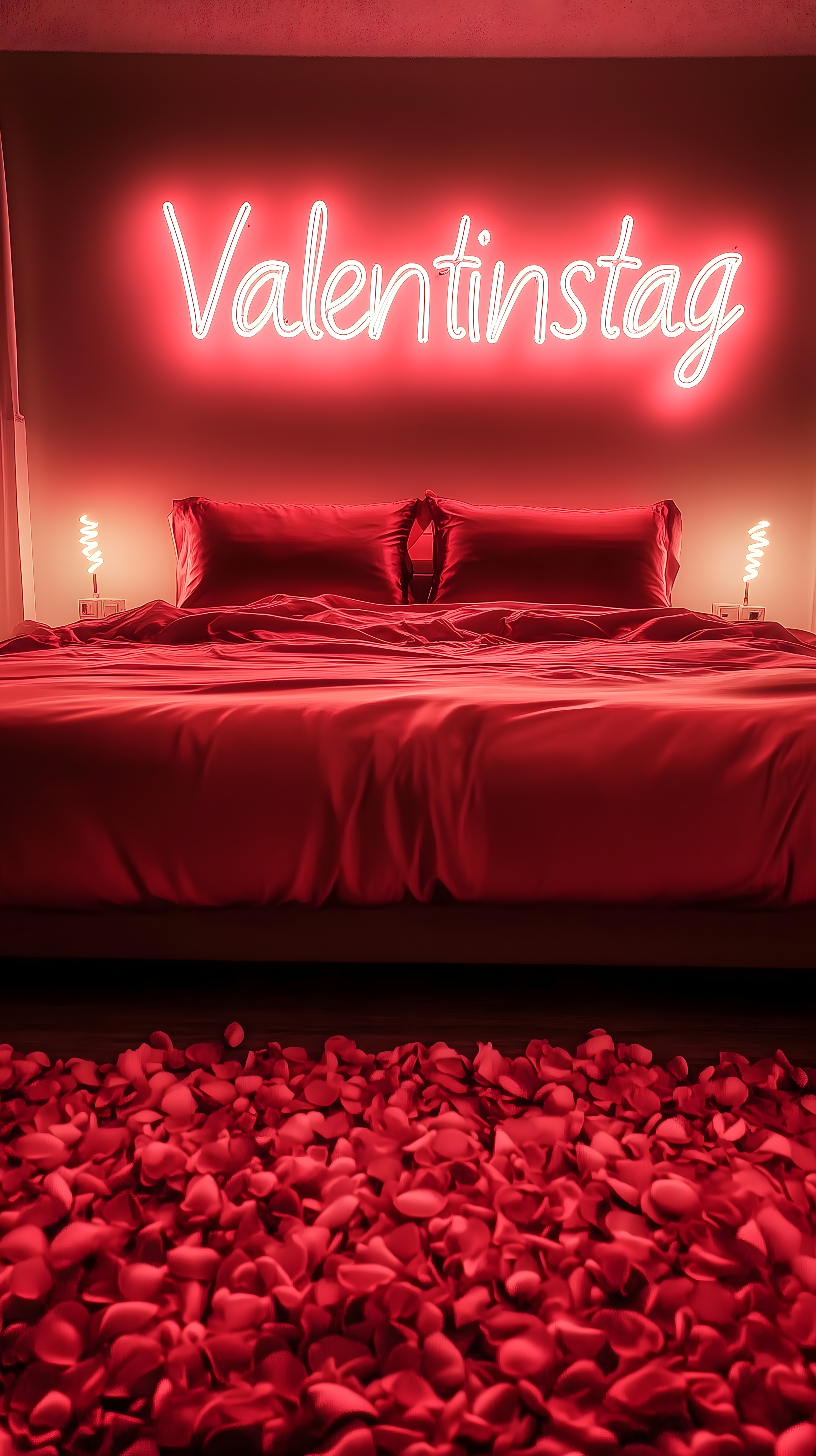 Das Bild zeigt ein stimmungsvolles Schlafzimmer, das perfekt für eine romantische Valentinstagsfeier inszeniert wurde. Der Raum ist in ein warmes, rotes Licht getaucht, das von einer Neonschrift 'Valentinstag' an der Wand reflektiert wird. Das Bett ist mit edlen, roten Satin-Laken bezogen und mit Rosenblättern bestreut, was eine sinnliche Atmosphäre erzeugt. Diese Aufnahme eignet sich hervorragend als Hintergrundbild für Valentinstags-Werbungen, romantische Blogbeiträge oder für Socialmedia-Postings rund um den Liebestag. Das hochauflösende Foto steht unter einer Creative-Commons-Lizenz kostenfrei zum Download zur Verfügung.