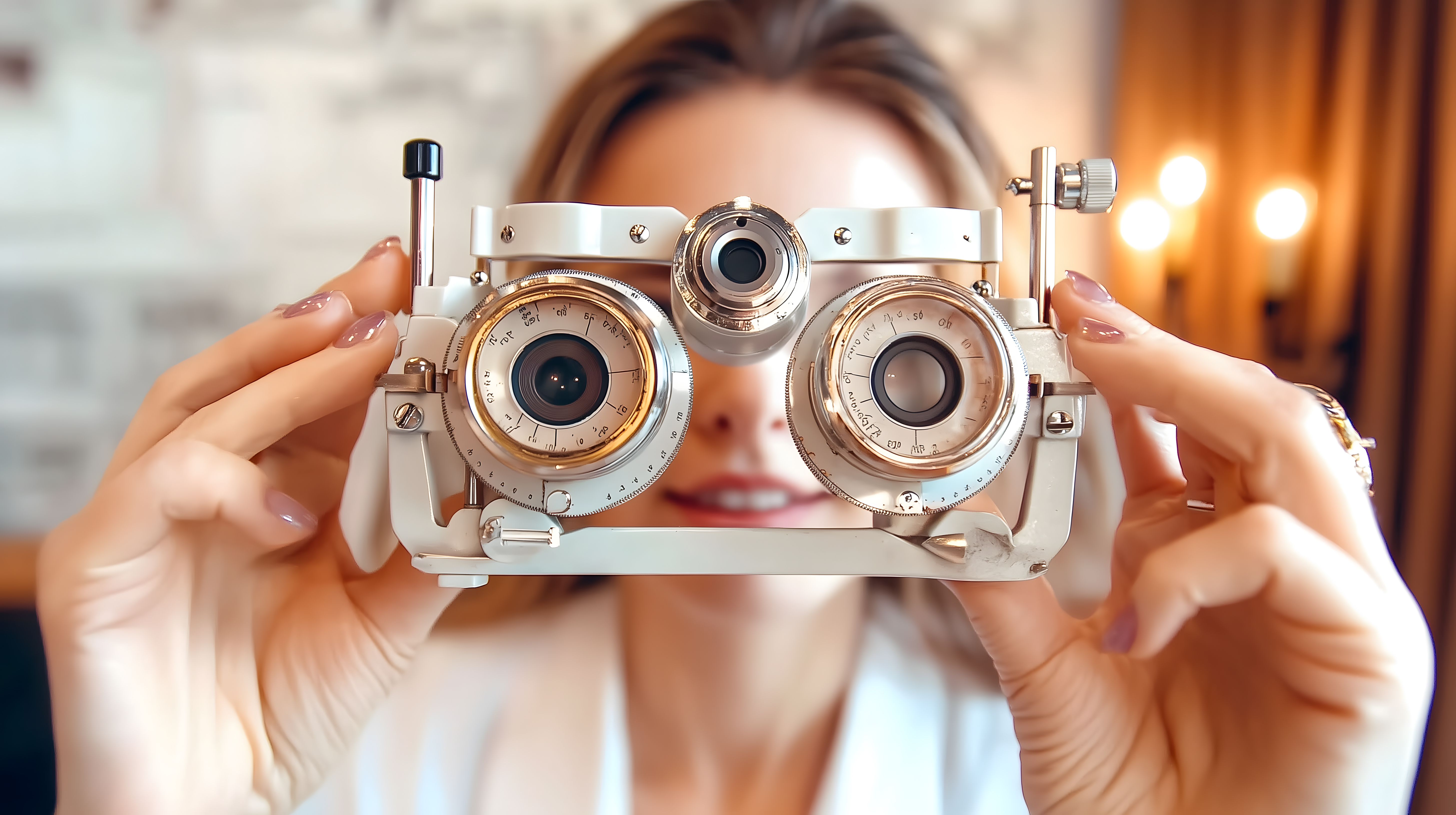 Das Bild zeigt eine junge Frau, die einen klassischen Phoropter, ein Sehtestgerät für Augenuntersuchungen, vor ihr Gesicht hält. Sie blickt konzentriert durch die Linsen, um ihre Sehschärfe testen zu lassen. Die Frau wirkt dabei professionell und sachverständig, was das Bild für den Einsatz in medizinischen, gesundheitlichen oder optischen Kontexten, wie zum Beispiel für Werbung, Blogbeiträge oder soziale Medien, sehr gut geeignet macht. Dieses kostenfreie, hochauflösende Stockfoto steht unter der Creative-Commons-Lizenz zur Verfügung.