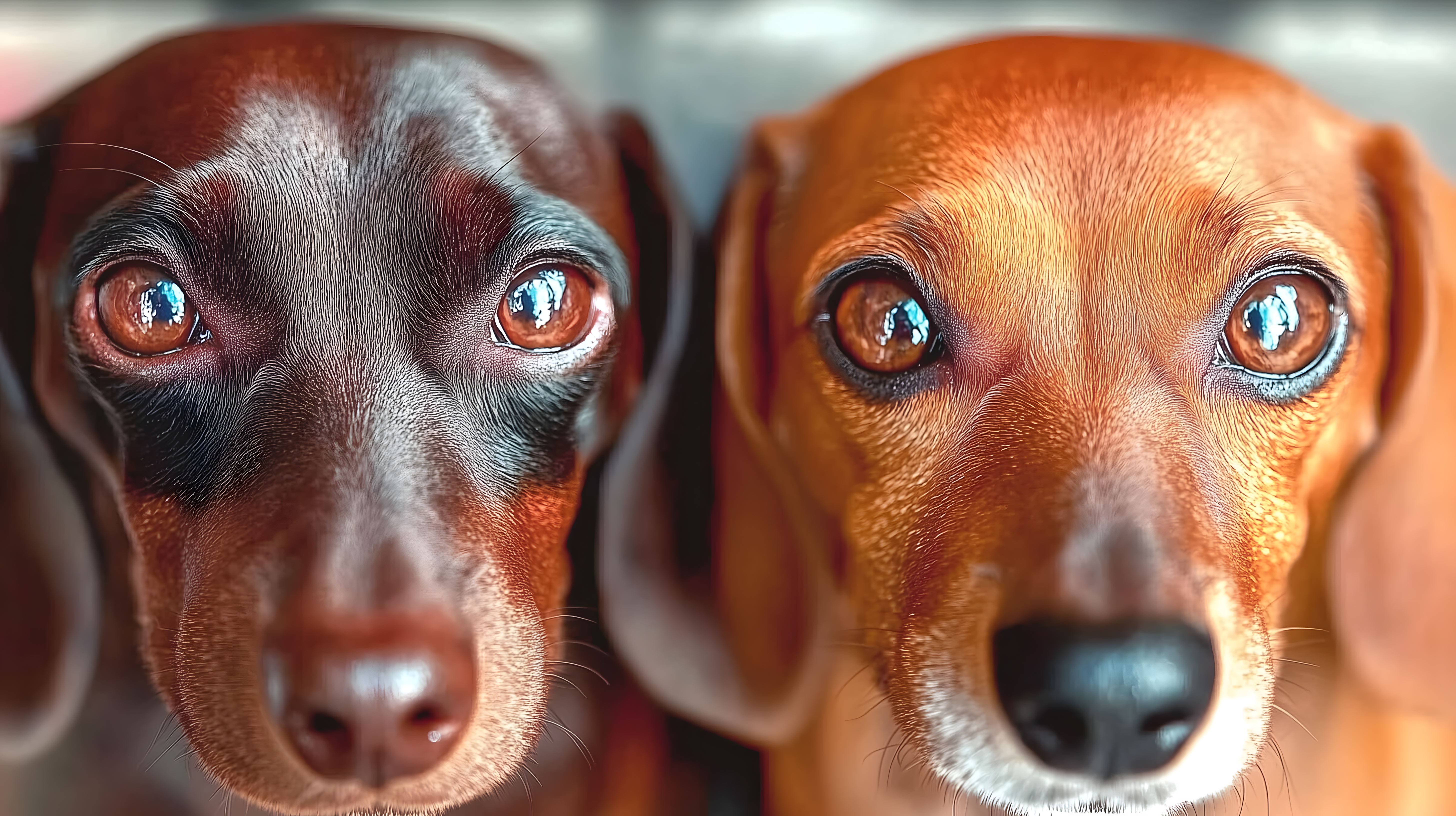 Diese faszinierende Nahaufnahme zeigt zwei Dackelhunde mit glänzendem, rötlich-braunem Fell und strahlenden Augen. Die detaillierten Porträts lassen den Betrachter tief in die ausdrucksstarken Gesichter der Tiere blicken. Die warmen Farbtöne und scharfe Fokussierung auf die Augen erzeugen eine besonders intensive und emotionale Wirkung. Dieses hochauflösende Stockfoto eignet sich hervorragend für verschiedenste Einsatzzwecke wie Blogbeiträge, Newsletter, Social-Media-Posts oder Werbematerialien rund um Haustiere und Heimtierbedarf. Die Aufnahme steht unter einer Creative-Commons-Lizenz zur kostenlosen Verwendung zur Verfügung.