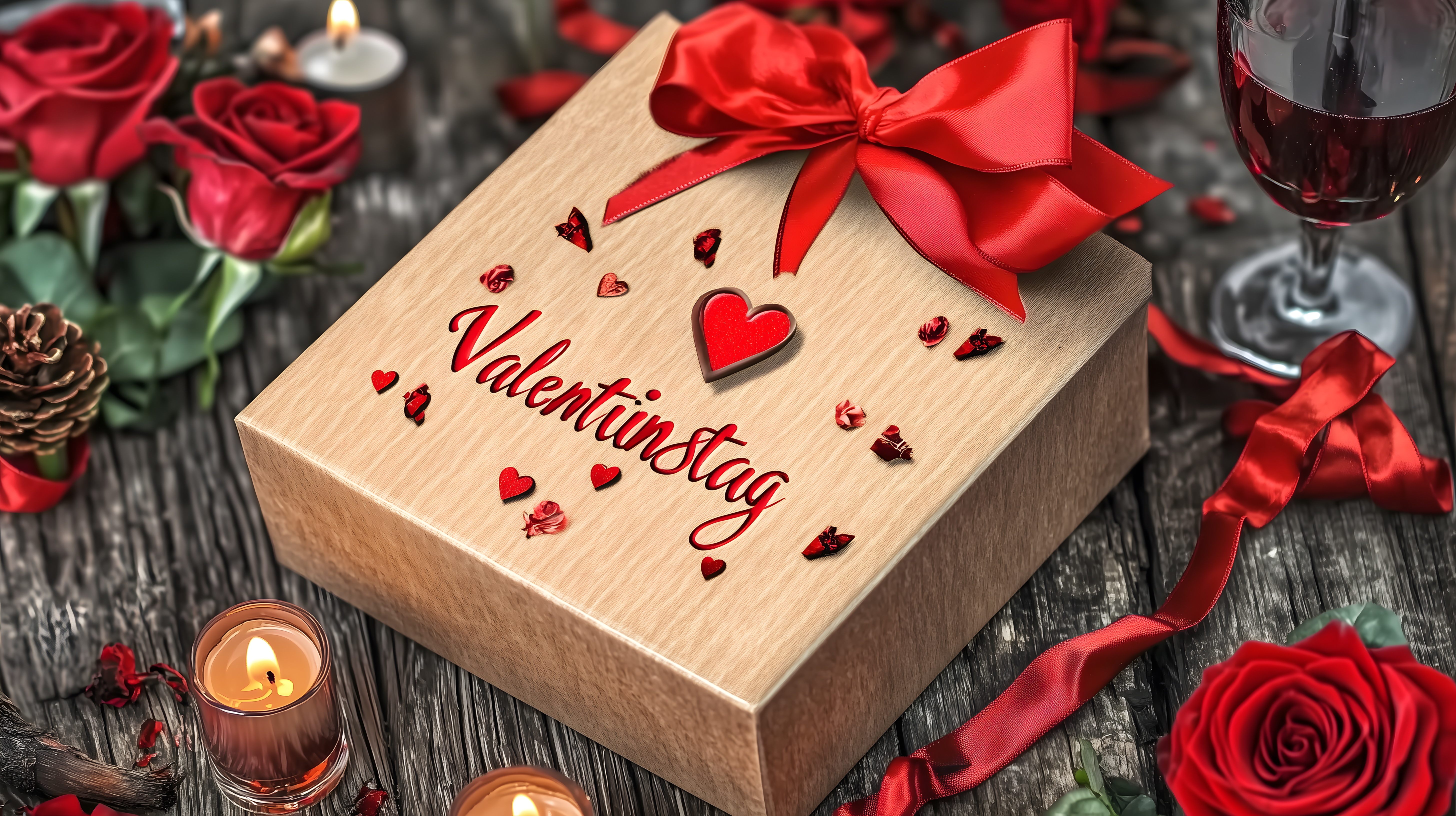 Dieses Foto zeigt eine wunderschöne, hölzerne Geschenkbox, dekoriert mit einer roten Schleife und umgeben von roten Rosen, Kerzen und einem Glas Rotwein. Die Komposition ist stimmungsvoll und romantisch, ideal für den Valentinstag oder andere Anlässe wie Hochzeiten, Jahrestage oder Geburtstage. Das hochauflösende Bild ist als kostenloses Stockfoto unter Creative-Commons-Lizenz verfügbar und kann für vielfältige Zwecke in Blogs, Newslettern oder auf Social-Media-Kanälen eingesetzt werden.
