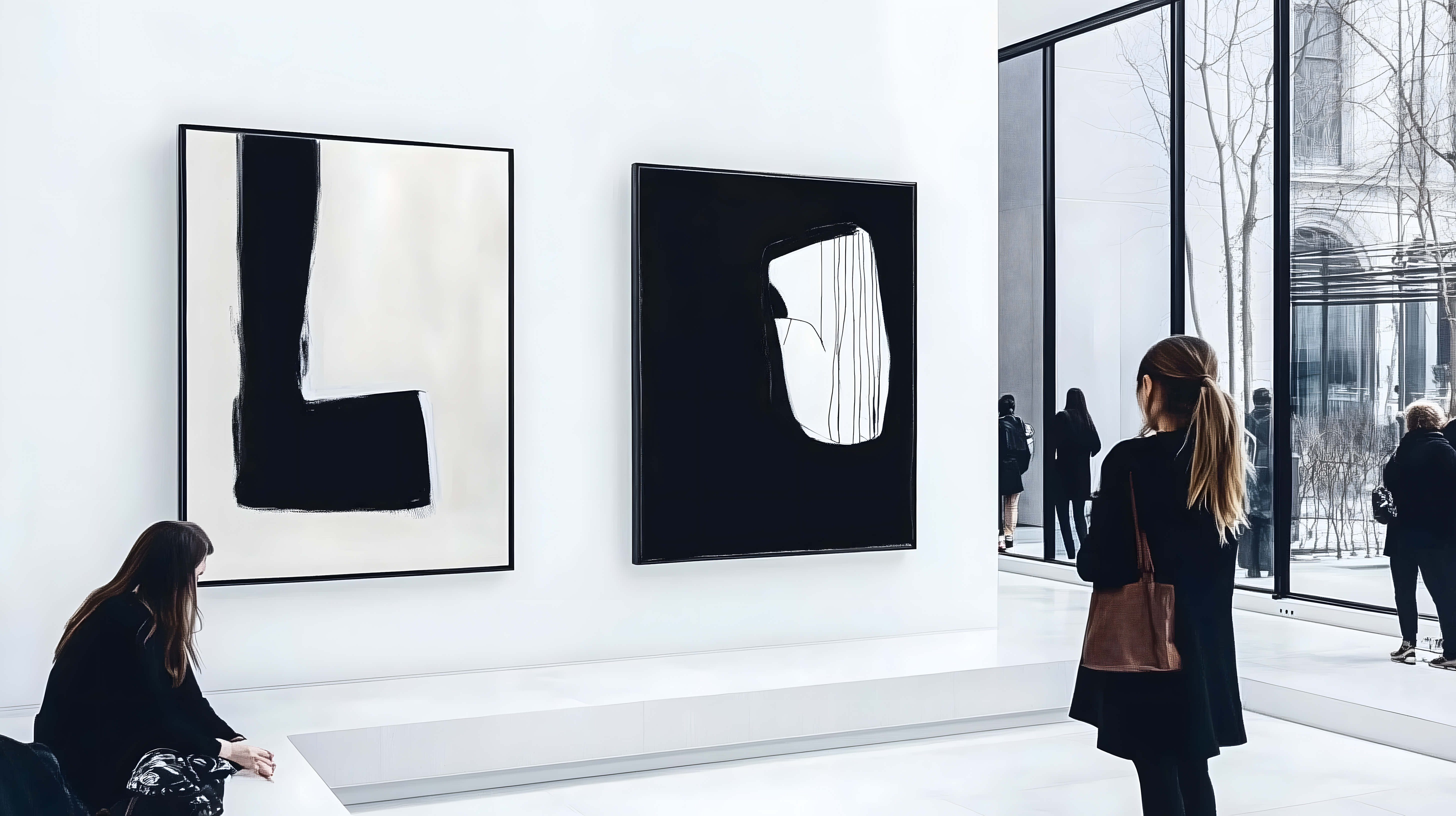Das Bild zeigt eine Kunstausstellung in einem modernen Museum mit großen Fenstern. Im Vordergrund hängen mehrere abstrakte Gemälde in schwarzen Rahmen an einer weißen Wand. Die Gemälde weisen einfache, geometrische Formen und Strukturen auf, die in kontrastreichem Schwarz-Weiß gehalten sind. Im Hintergrund sind Besucher zu sehen, die die Ausstellung betrachten. Die minimalistische Ästhetik und der kühle, sachliche Charakter der Bilder und des Ausstellungsraums schaffen eine zeitgenössische, kunstvolle Atmosphäre.