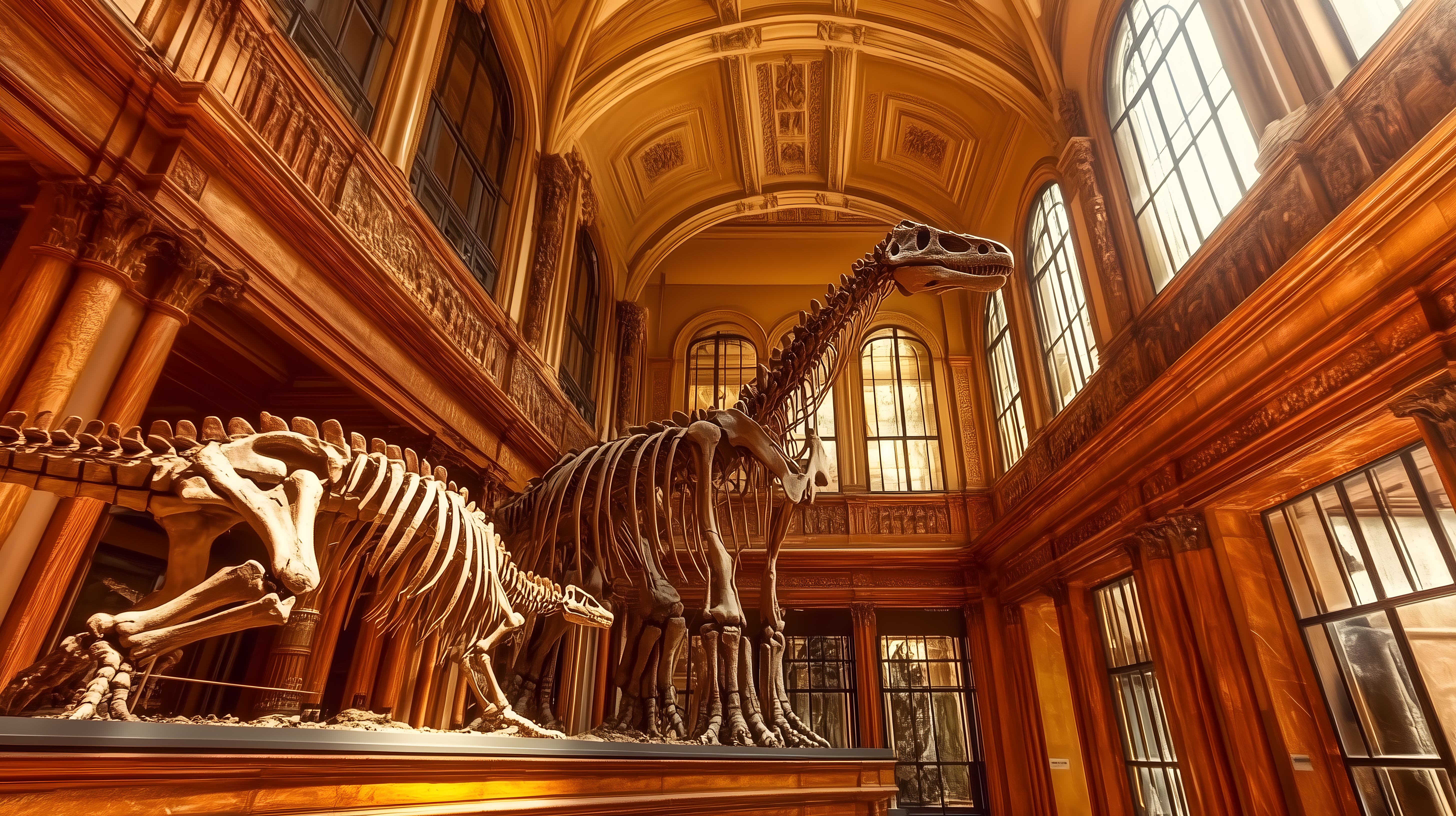 Das Bild zeigt ein beeindruckendes Interieur eines Naturkundemuseums. Im Vordergrund dominiert ein großes, vollständiges Dinosaurierskelett, das in einem hölzernen, historischen Ausstellungsraum präsentiert wird. Die hohen Decken und Wände sind reich verziert und in warmen Brauntönen gehalten, was dem Raum eine mystische Atmosphäre verleiht. Große Fenster lassen natürliches Licht herein und tauchen alles in ein warmes, goldenes Licht. Dieses hochwertige Stockfoto in hoher Auflösung eignet sich hervorragend für die Gestaltung von Websites, Blogs, Werbe- und Bildungsmaterialien rund um Naturwissenschaften, Museen, Architektur und historische Stätten. Es steht unter einer Creative-Commons-Lizenz zur kostenfreien Nutzung zur Verfügung.