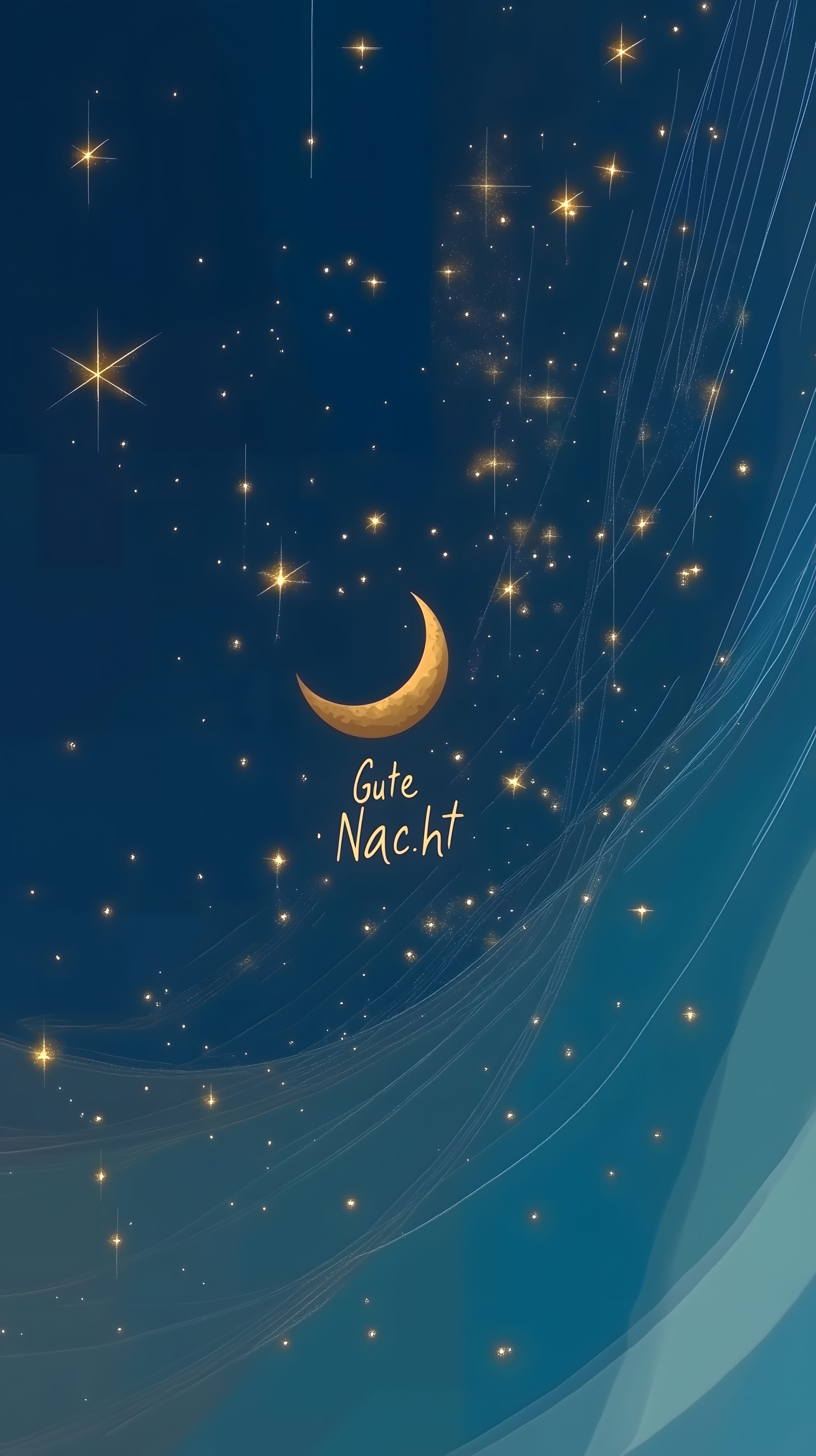 Dieses stimmungsvolle Foto zeigt einen nachtlichen Sternenhimmel mit einem goldenen Halbmond und funkelnden Sternschnuppen. Das Bild ist in dunklen Blau- und Türkistönen gehalten, was eine ruhige und mystische Atmosphäre schafft. Die Komposition mit den Linien und dem Textfeld 'Gute Nacht' verleiht dem Motiv einen romantischen, dekorativen Charakter. Dieses frei verfügbare Stockfoto eignet sich perfekt als Hintergrundbild für Blogs, Websites oder Social-Media-Posts, zum Beispiel für Gute-Nacht-Grüße oder Artikel über Schlaf, Träume und Entspannung. Es ist in hoher Auflösung und unter Creative-Commons-Lizenz verfügbar.
