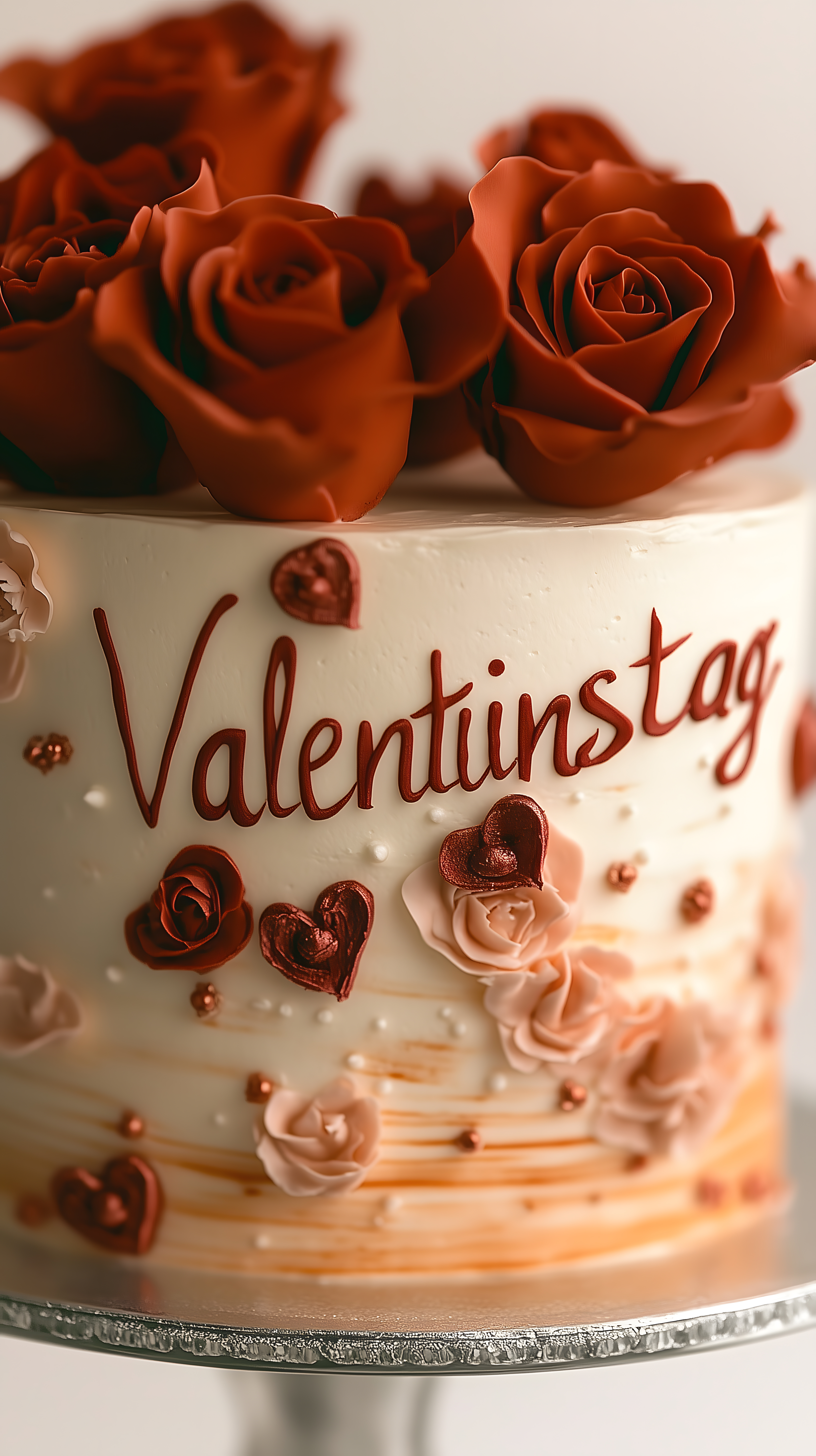 Das Bild zeigt eine wunderschöne Torte, die speziell für den Valentinstag dekoriert wurde. Die Torte ist mit mehreren üppigen roten Rosen verziert, die sehr realistisch und detailliert dargestellt sind. Der cremige Untergrund der Torte hat eine leicht strukturierte Oberfläche und ist ebenfalls mit roten, herz-förmigen Dekorationen versehen. Das Gesamtbild vermittelt eine romantische und feierliche Stimmung, die perfekt für Valentinstag-Anlässe wie Partys, Hochzeiten oder Geburtstagsfeiern geeignet ist. Dieses hochauflösende Stockfoto steht unter einer Creative-Commons-Lizenz zum kostenlosen Download zur Verfügung und kann für verschiedene Zwecke, wie Blogs, Newsletter oder Werbematerialien, genutzt werden.
