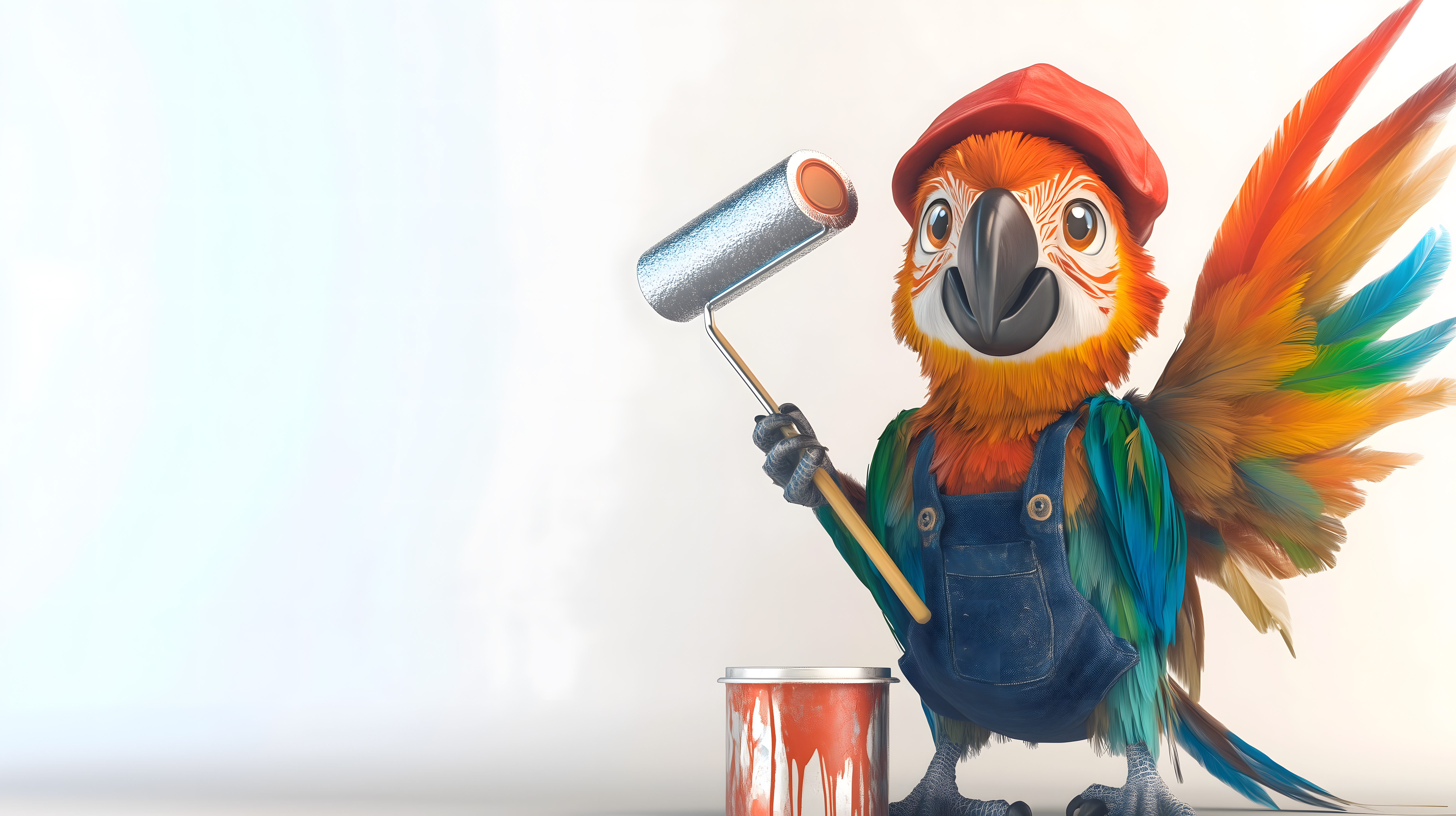 Dieses lustige Bild zeigt einen farbenfrohen Papagei, der eine Farbwalze und einen Farbbecher in seinen Krallen hält. Der Vogel trägt eine rote Kappe und hat ein gefiedertes, buntes Aussehen. Er steht vor einem weißen Hintergrund, was den Fokus ganz auf die detailreiche Darstellung des Papageis lenkt. Dieses Stockfoto eignet sich hervorragend für Werbematerialien, Newsletter, Blogbeiträge oder Social-Media-Posts mit einem kreativen, humorvollen Touch. Das Bild ist in hoher Auflösung und unter einer Creative-Commons-Lizenz verfügbar.