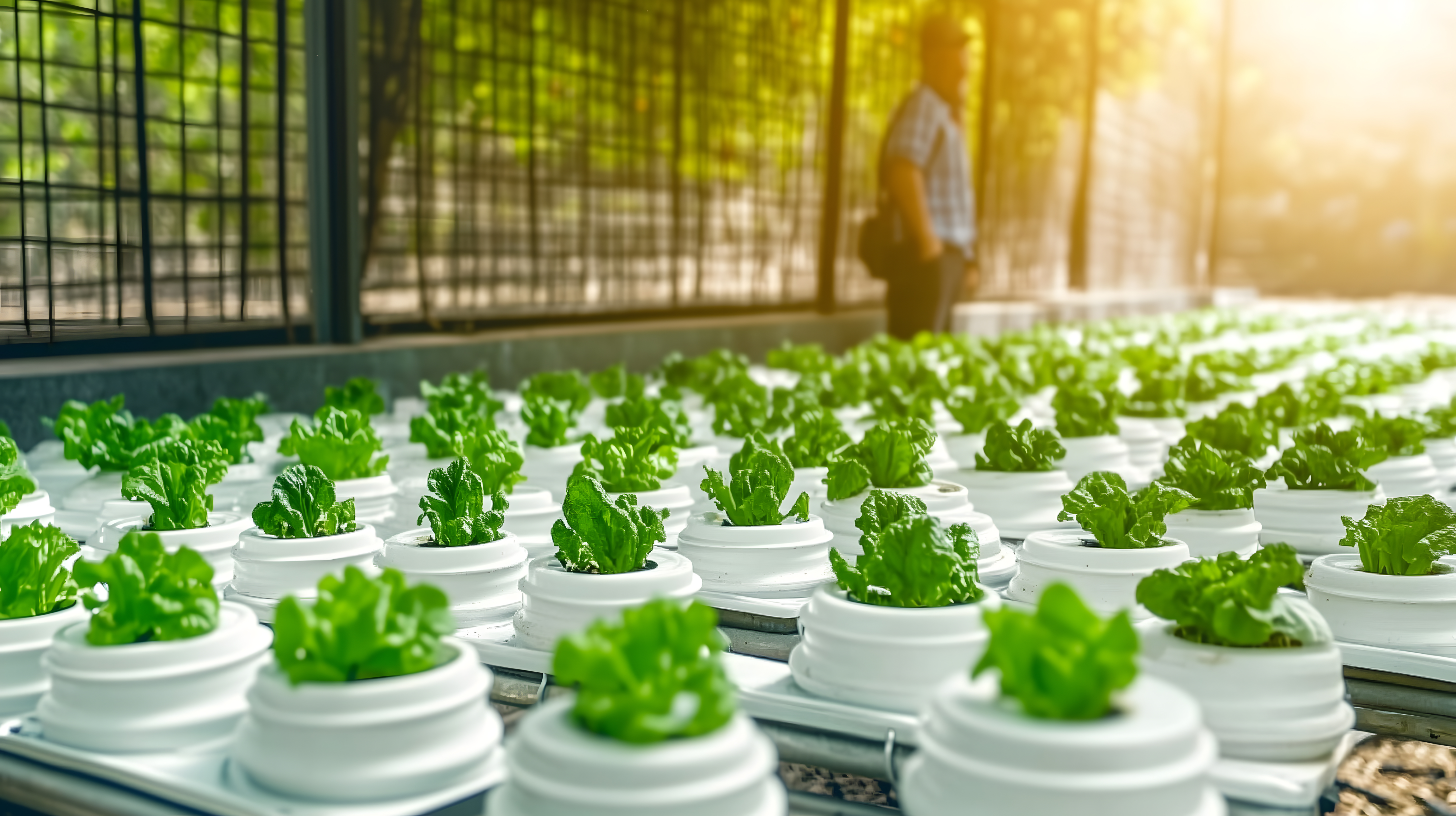Das Bild zeigt eine Reihe von frisch geernteten Salatköpfen, die in weißen Töpfen in einem modernen Gewächshaus aufgestellt sind. Das Gewächshaus ist von Fenstern umgeben, die das natürliche Tageslicht hereinlassen und eine angenehme, helle Atmosphäre schaffen. Der Fokus liegt auf den üppigen, grünen Salatblättern, die in den Töpfen stehen und ein Bild von Frische, Sauberkeit und Nachhaltigkeit vermitteln.