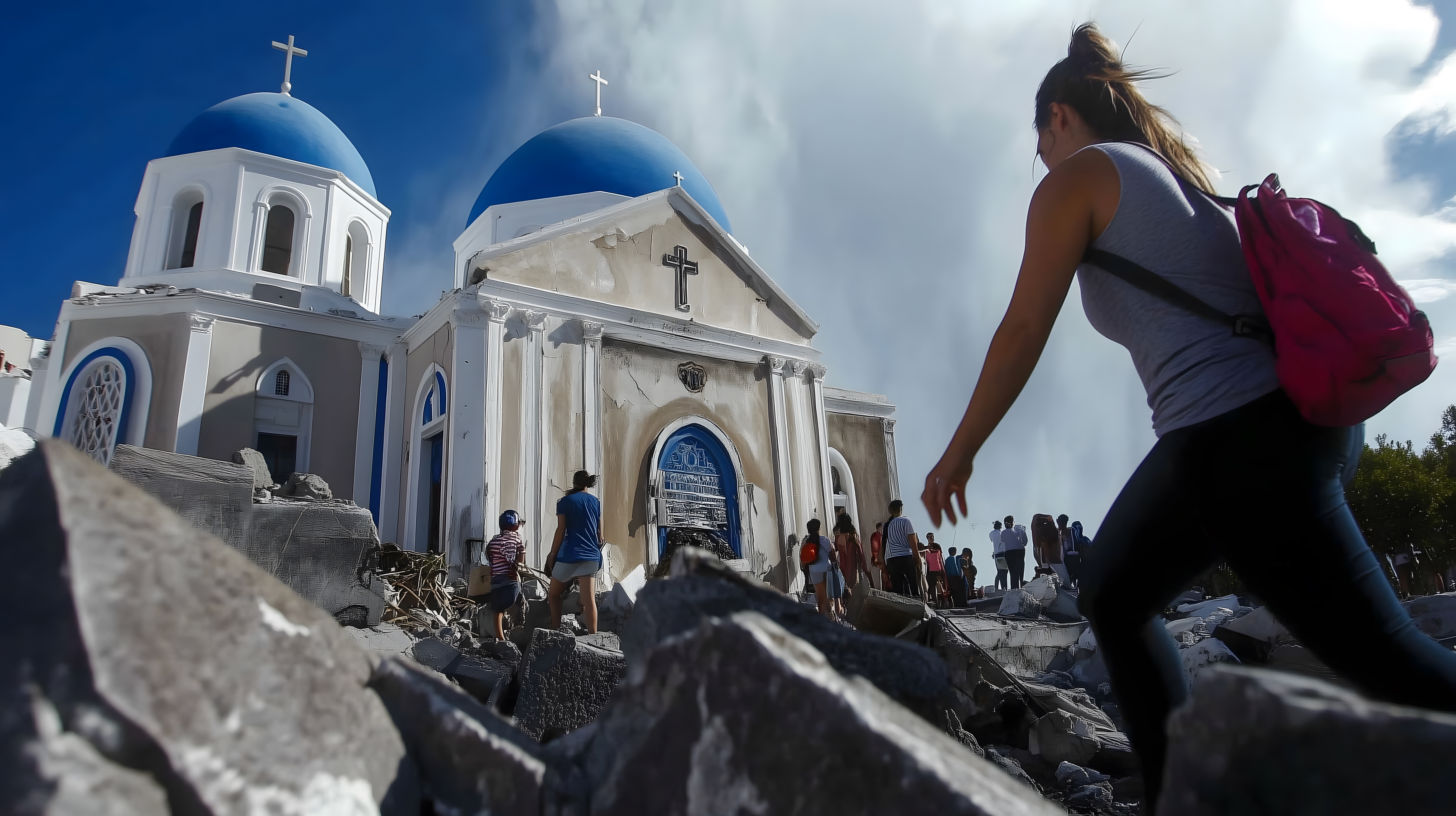 Das Bild zeigt eine zerstörte griechisch-orthodoxe Kirche auf der Insel Santorini nach einem Erdbeben. Die weißen Außenwände und charakteristischen blauen Kuppeln sind beschädigt, und Trümmerteile liegen auf den Stufen vor dem Eingang. Eine Gruppe von Menschen, die offenbar die Ruine erkunden, ist im Vordergrund zu sehen. Der kontrastreiche Himmel mit Wolken und die felsige Umgebung verleihen dem Bild eine dramatische Stimmung.