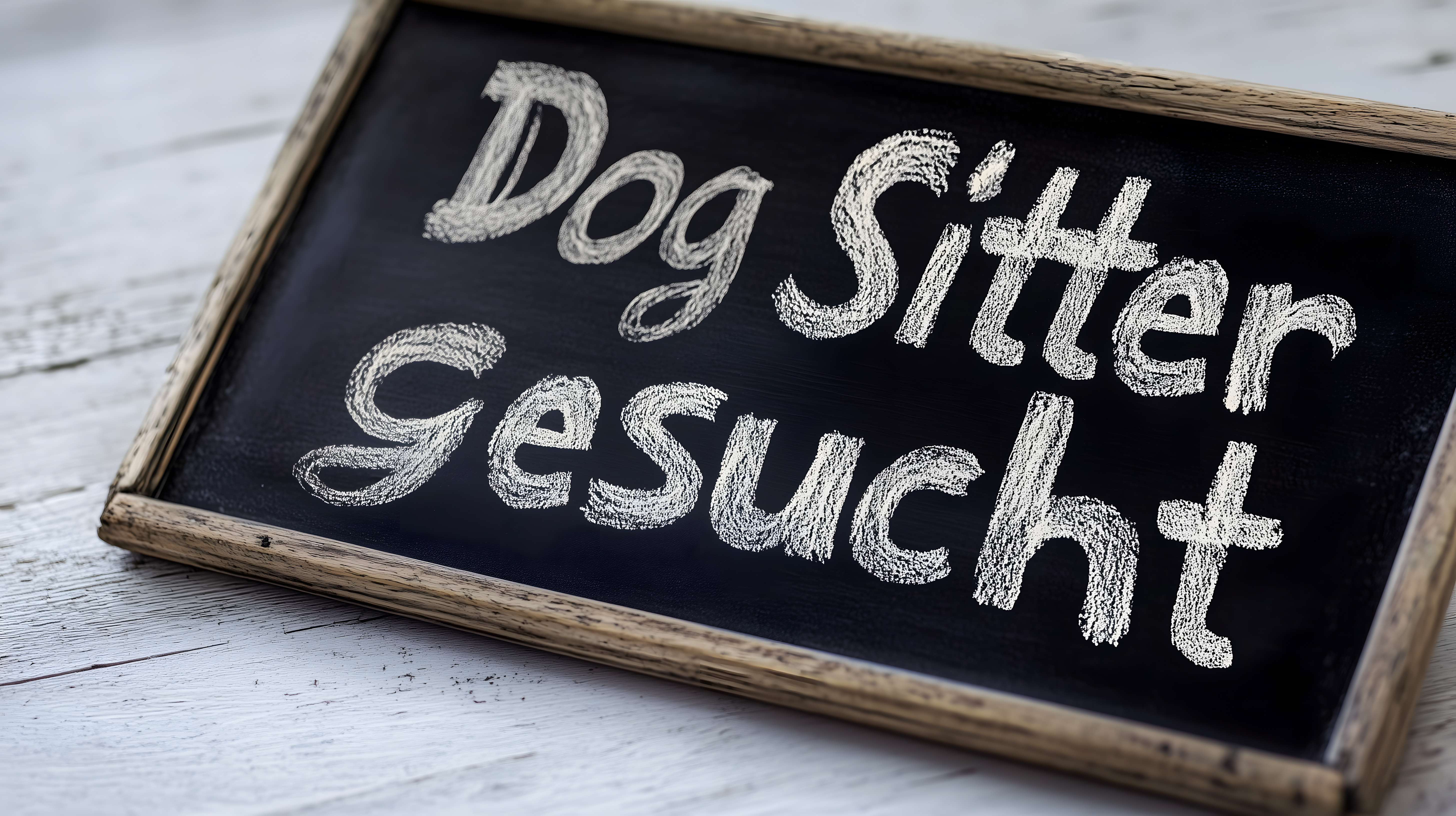 Das Bild zeigt eine rustikale Kreidetafel in einem Holzrahmen. Darauf ist in weißer Kreide der Text 'Dog Sitter Gesucht' geschrieben. Die Tafel steht auf einem alten, verwitterten Holztisch oder Boden. Die Schwarz-Weiß-Optik und der rustikale Stil verleihen dem Foto einen vintage und handgefertigten Charakter. Diese Kreidetafel könnte beispielsweise in einem Blog, Newsletter oder Social-Media-Post für Dienstleistungen rund um Hundesitting verwendet werden. Als kostenloses Stockfoto in hoher Auflösung und unter einer Creative-Commons-Lizenz steht es für vielfältige Einsatzzwecke zur Verfügung.