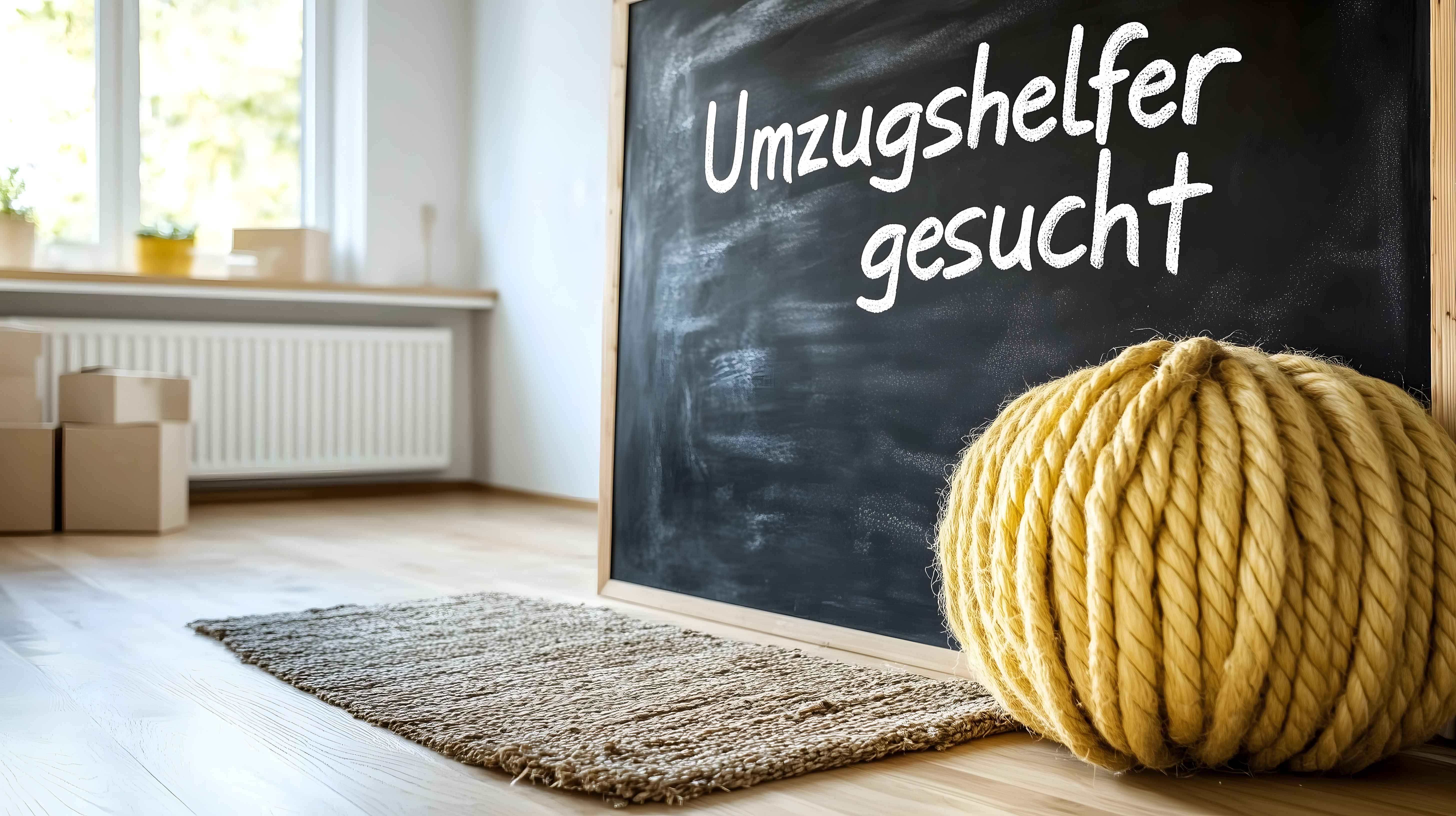 Das Foto zeigt eine Tafel mit der Aufschrift 'Umzugshelfer gesucht' in einem hellen, gemütlichen Raum. Im Vordergrund befindet sich ein gelbes, dekoratives Seil, das den Fokus auf die Stellenanzeige lenkt. Im Hintergrund sind Kartons zu sehen, was das Thema des Umzugs und der Wohnungssuche unterstreicht. Das Bild vermittelt eine einladende, freundliche Atmosphäre und kann als kostenloses Stockfoto für Blogartikel, Social-Media-Beiträge oder Werbekampagnen rund um Umzug, Wohnungssuche, Arbeit und Beschäftigung verwendet werden. Die hohe Auflösung und Creative-Commons-Lizenz machen es zu einem vielseitig einsetzbaren, hochwertigen Foto.