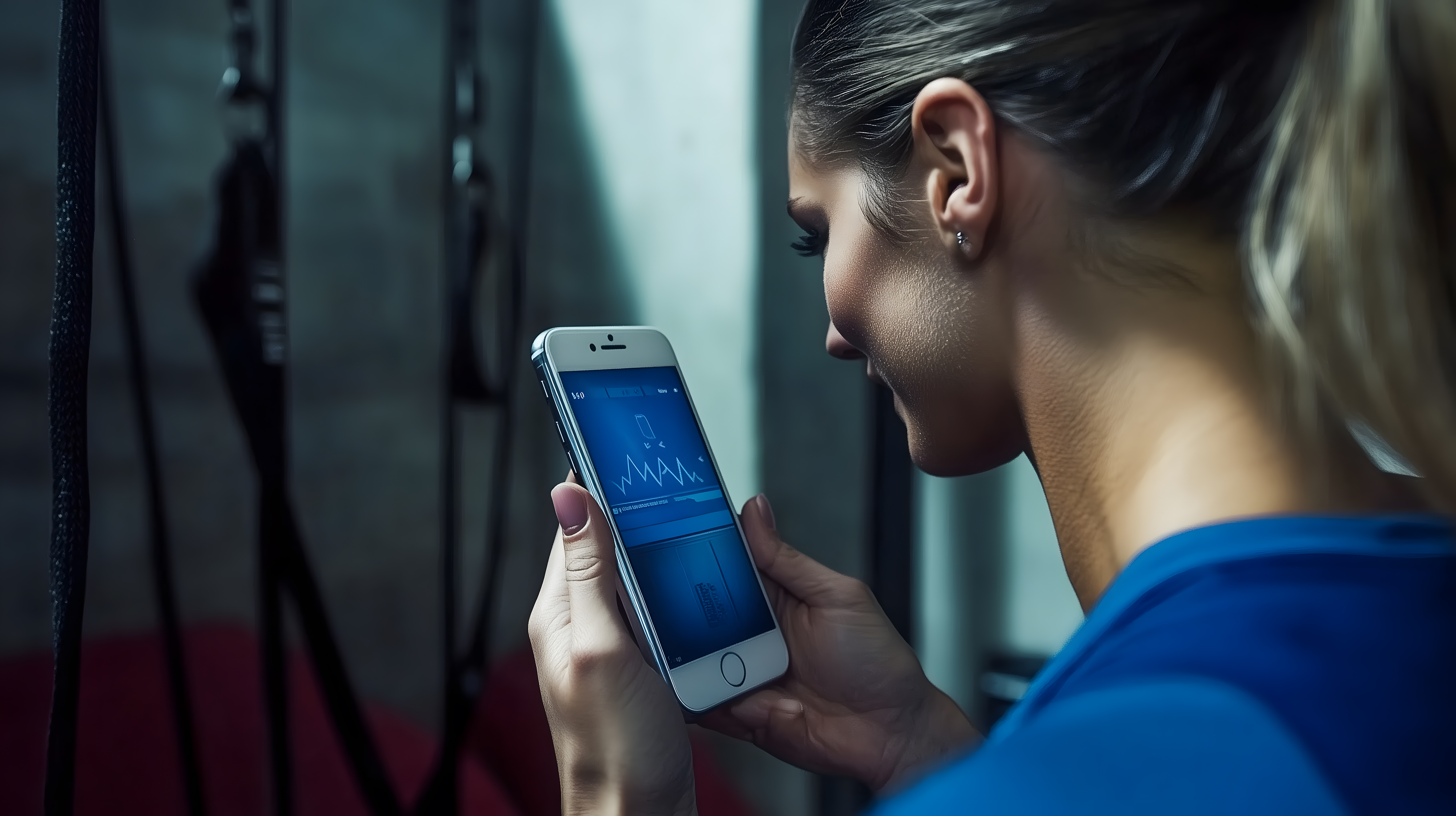 Das Bild zeigt eine Frau, die in einem Fitnessstudio steht und konzentriert auf ihr Smartphone schaut. Auf dem Display ist eine Fitness-App zu sehen, die vermutlich ihren Trainingsfortschritt, ihre Herzfrequenz oder andere Fitnessdaten anzeigt. Die Frau trägt Sportkleidung und hat ihre Haare zu einem Pferdeschwanz zusammengebunden. Der Hintergrund ist dunkel und verwischt, sodass der Fokus ganz auf der Frau und ihrem Smartphone liegt. Dieses Bild eignet sich hervorragend für den Einsatz in Blogs, Newslettern oder sozialen Medien rund um die Themen Fitness, Gesundheit und Lebensstil. Es ist in hoher Auflösung und unter einer Creative-Commons-Lizenz verfügbar.