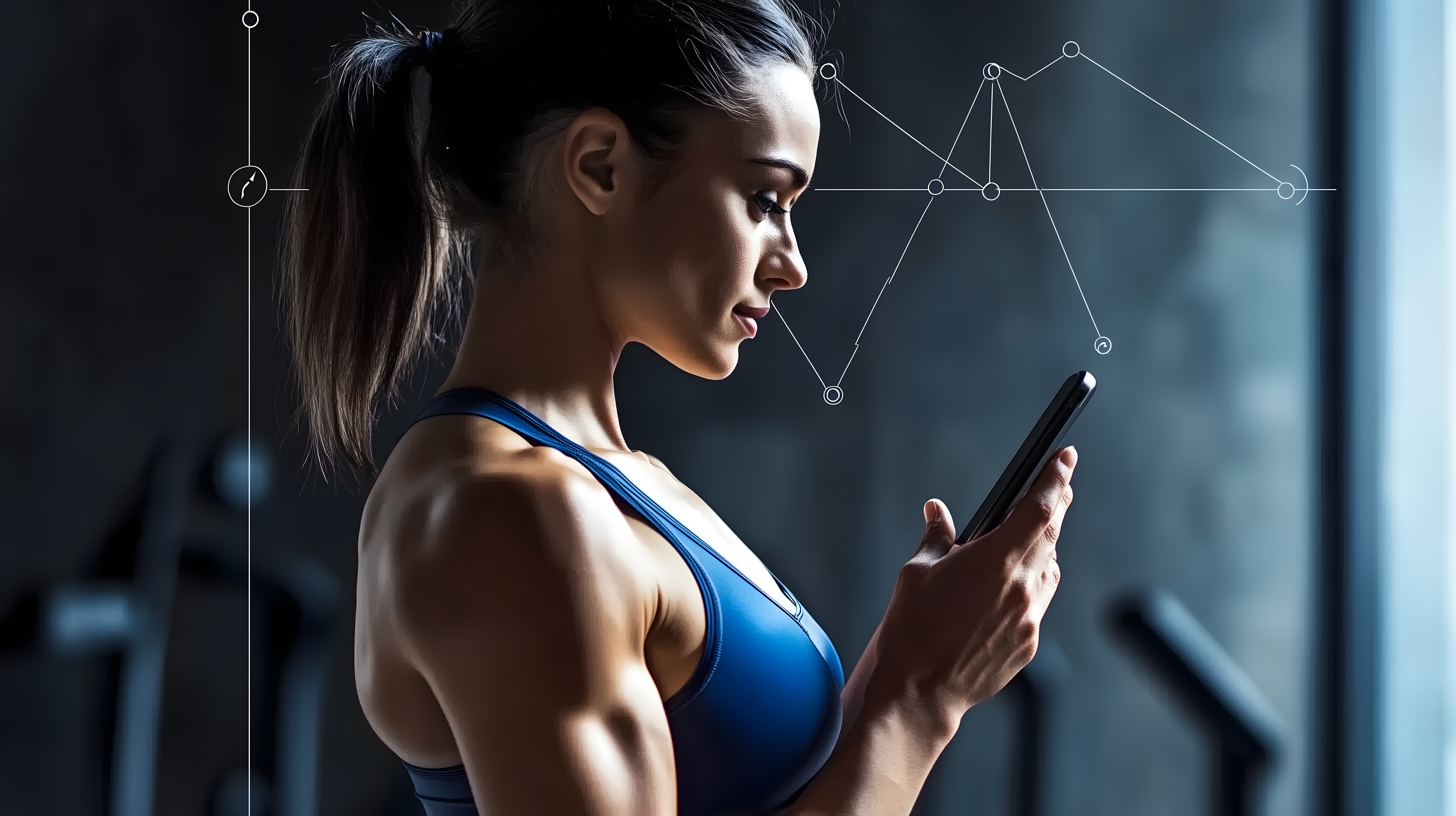 Das Bild zeigt eine junge, trainierte Frau in Sportbekleidung, die konzentriert auf ihr Smartphone blickt und offenbar ihre Körperdaten und Trainingsergebnisse analysiert. Im Hintergrund ist ein Diagramm zu sehen, das ihre Fortschritte visualisiert. Die Szene vermittelt den Eindruck von Disziplin, Zielstrebigkeit und der Nutzung moderner Technologie zur Optimierung des eigenen Körpers und der Fitness.