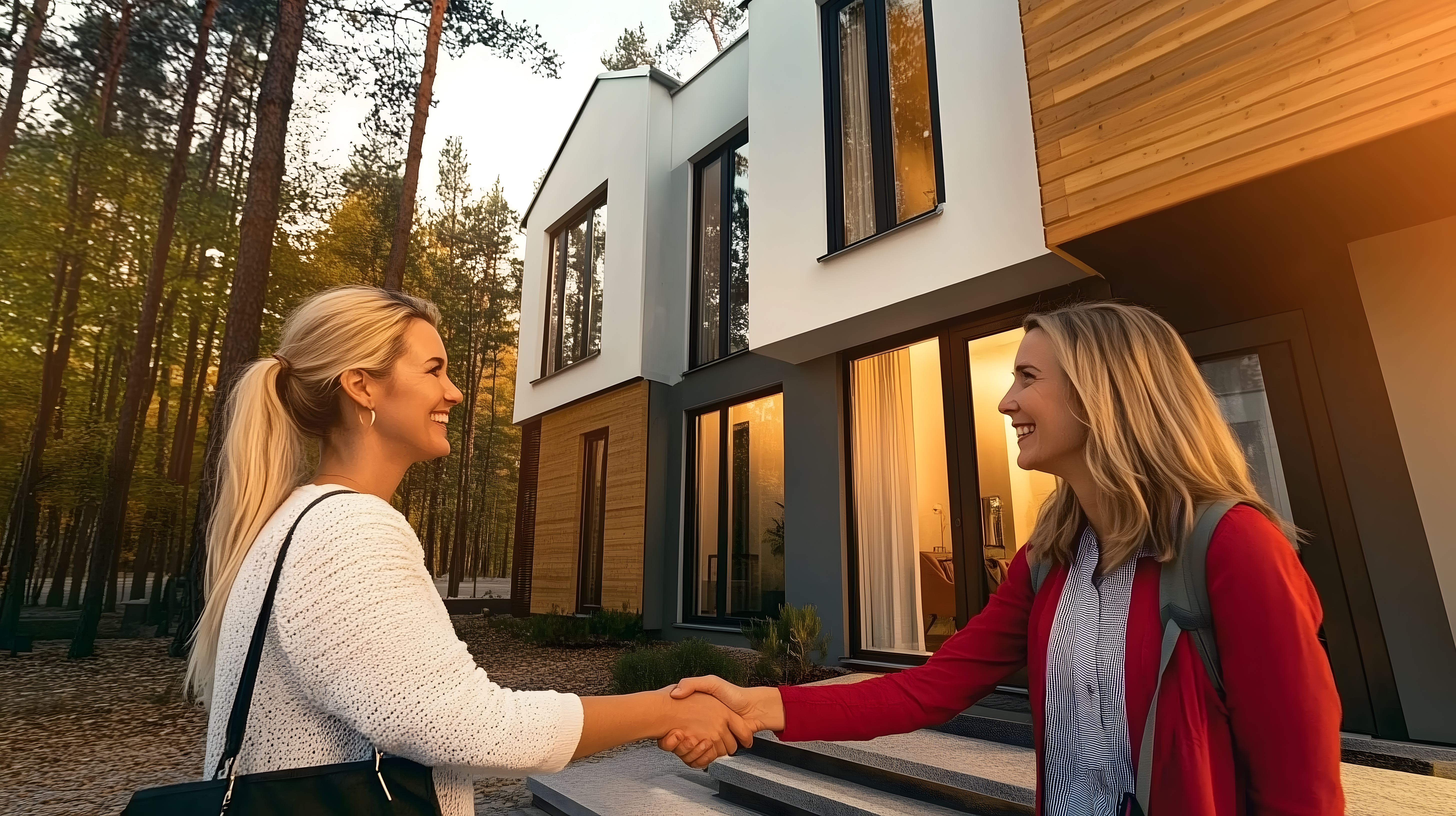 Das Bild zeigt eine Begrüßung zwischen einer Immobilienmaklerin und einem Kunden vor einem modernen Einfamilienhaus in einer Waldumgebung. Sie stehen auf den Stufen des Hauses und schütteln sich die Hände, was auf eine positive Geschäftsbeziehung und einen erfolgreichen Immobilienverkauf hindeutet. Das Haus hat eine Holzfassade und viele große Fenster, die es hell und einladend erscheinen lassen. Die Herbstlandschaft im Hintergrund fügt dem Bild eine natürliche, warme Atmosphäre hinzu.