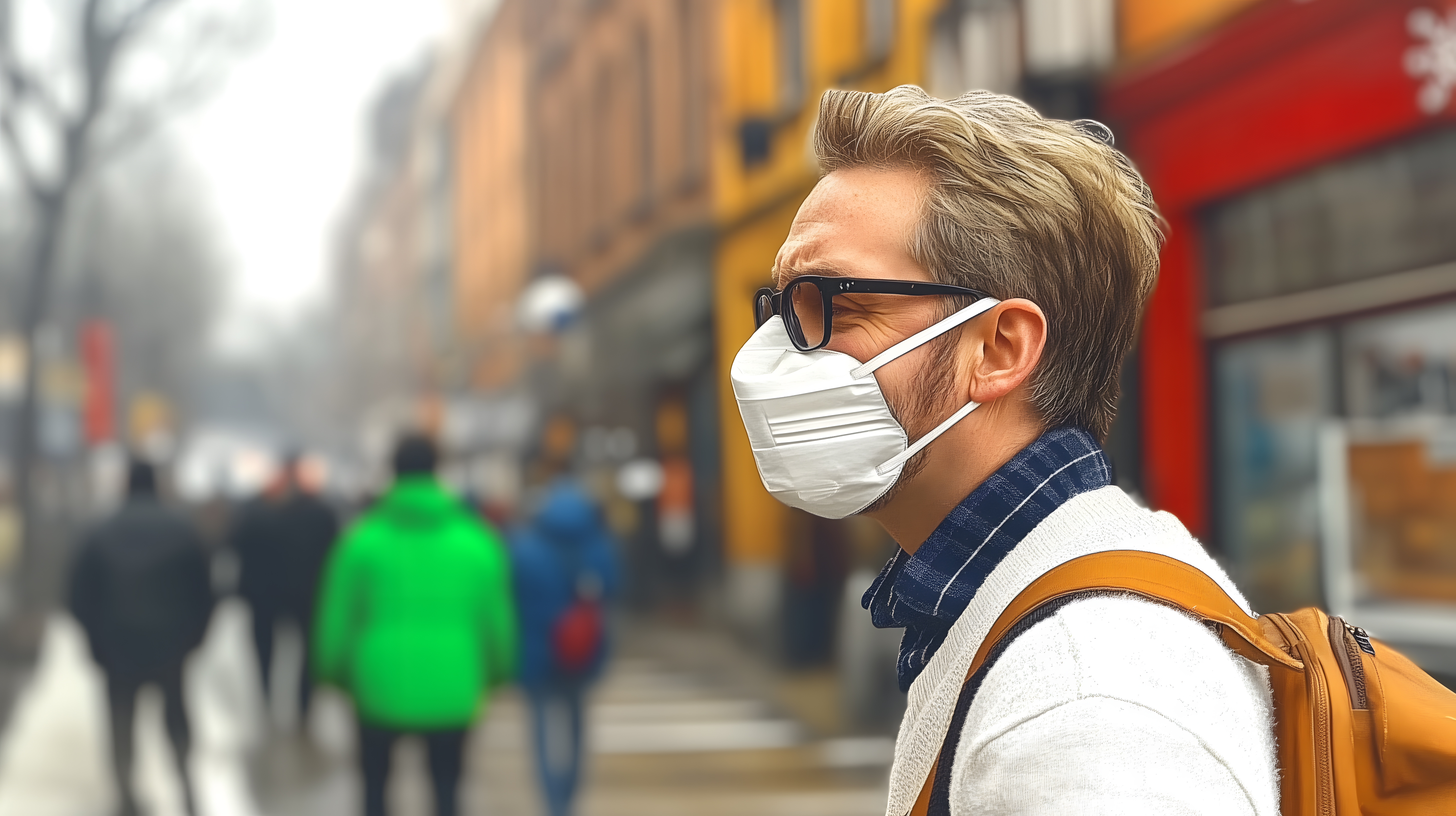 Das Foto zeigt einen Mann, der in einer belebten Stadtstraße eine Schutzmaske trägt. Er ist in einen dunkelgrauen Mantel gekleidet und trägt eine Brille. Im Hintergrund sind weitere Passanten zu sehen, die sich ebenfalls durch die Straße bewegen. Die Fassaden der Geschäfte und Gebäude, die rot und orange leuchten, bilden einen farbenfrohen Kontrast zu der grauen, leicht verschwommenen Stimmung.