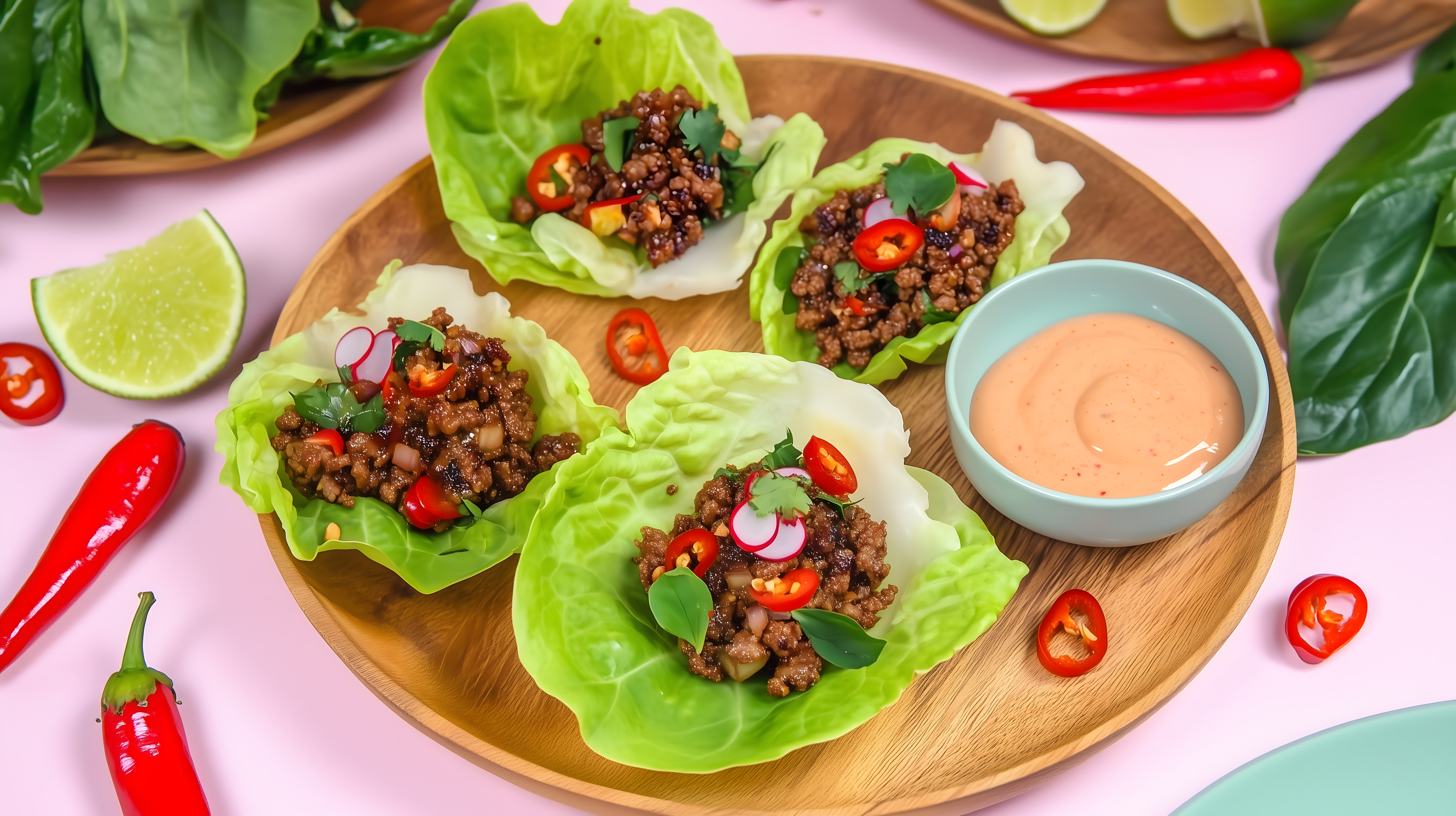 Das Foto zeigt eine delikate Kombination aus knackigen Salatblättern, würzigem Hackfleisch-Gemüse-Mix und einer cremigen Chilisauce. Die Zutaten sind auf einer rustikalen Holzplatte angerichtet, umgeben von frischen Limettenscheiben und roten Chilischoten. Die Salat-Wraps bieten ein ausgewogenes, gesundes Geschmackserlebnis und können sowohl als Hauptgericht als auch als leckere Vorspeise serviert werden. Dieses kostenlose Stockfoto in hoher Auflösung unter Creative-Commons-Lizenz eignet sich perfekt für Blogs, Websites oder Social-Media-Posts rund um gesunde Ernährung, Kochen und Kulinarik.