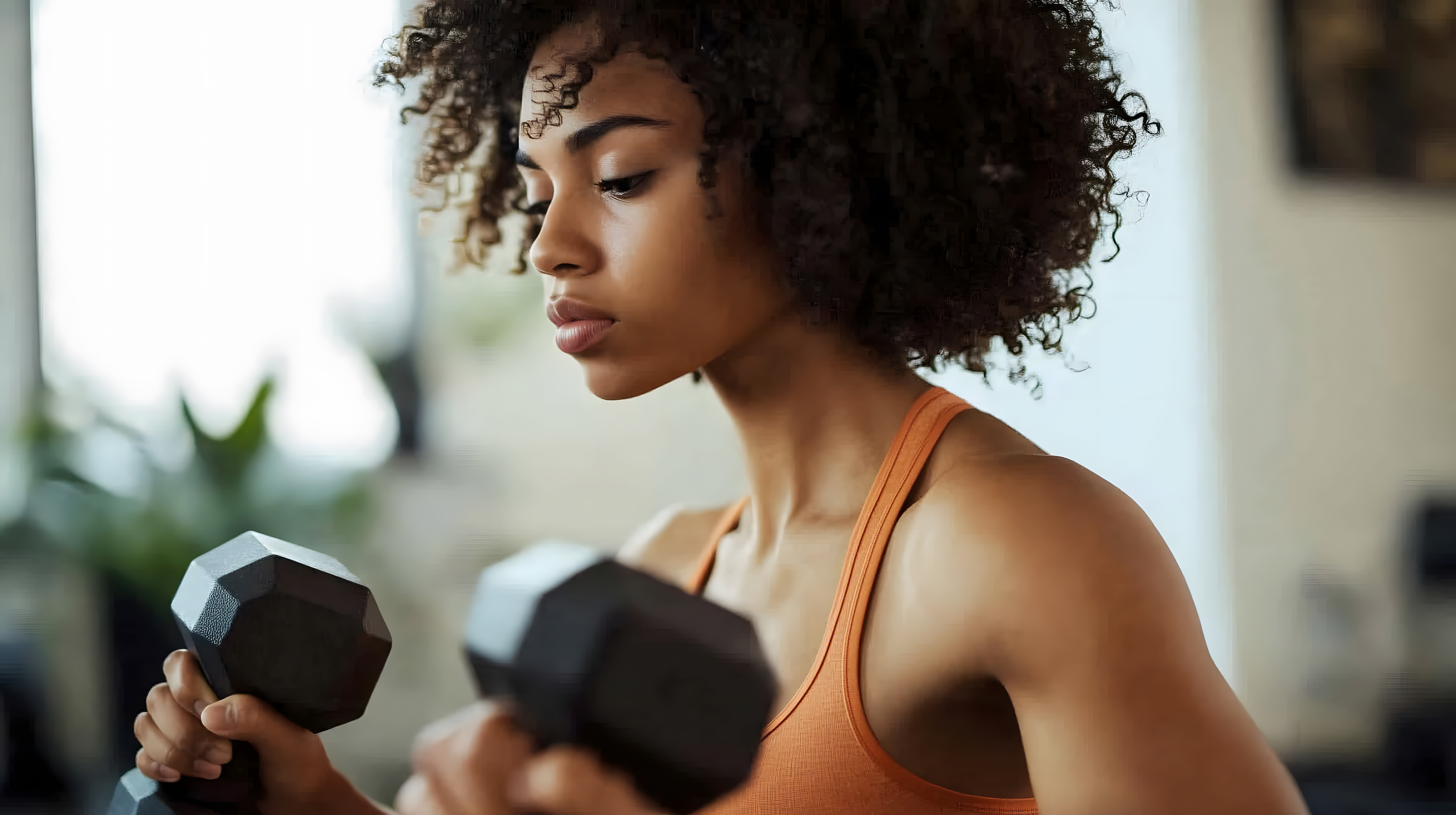 Dieses Stockfoto zeigt eine junge, afroamerikanische Frau beim Krafttraining mit Hanteln in einem Fitnessstudio. Sie ist fokussiert und konzentriert, ihre Lockenpracht leuchtet in natürlichem Licht. Das hochauflösende Bild eignet sich hervorragend für Fitnessblog-Beiträge, Werbung für Fitnessprogramme, Newsletter zum Thema gesunder Lebensstil oder Social-Media-Inhalte rund um Sport und Workout. Es steht unter einer Creative-Commons-Lizenz zum kostenlosen Download zur Verfügung.