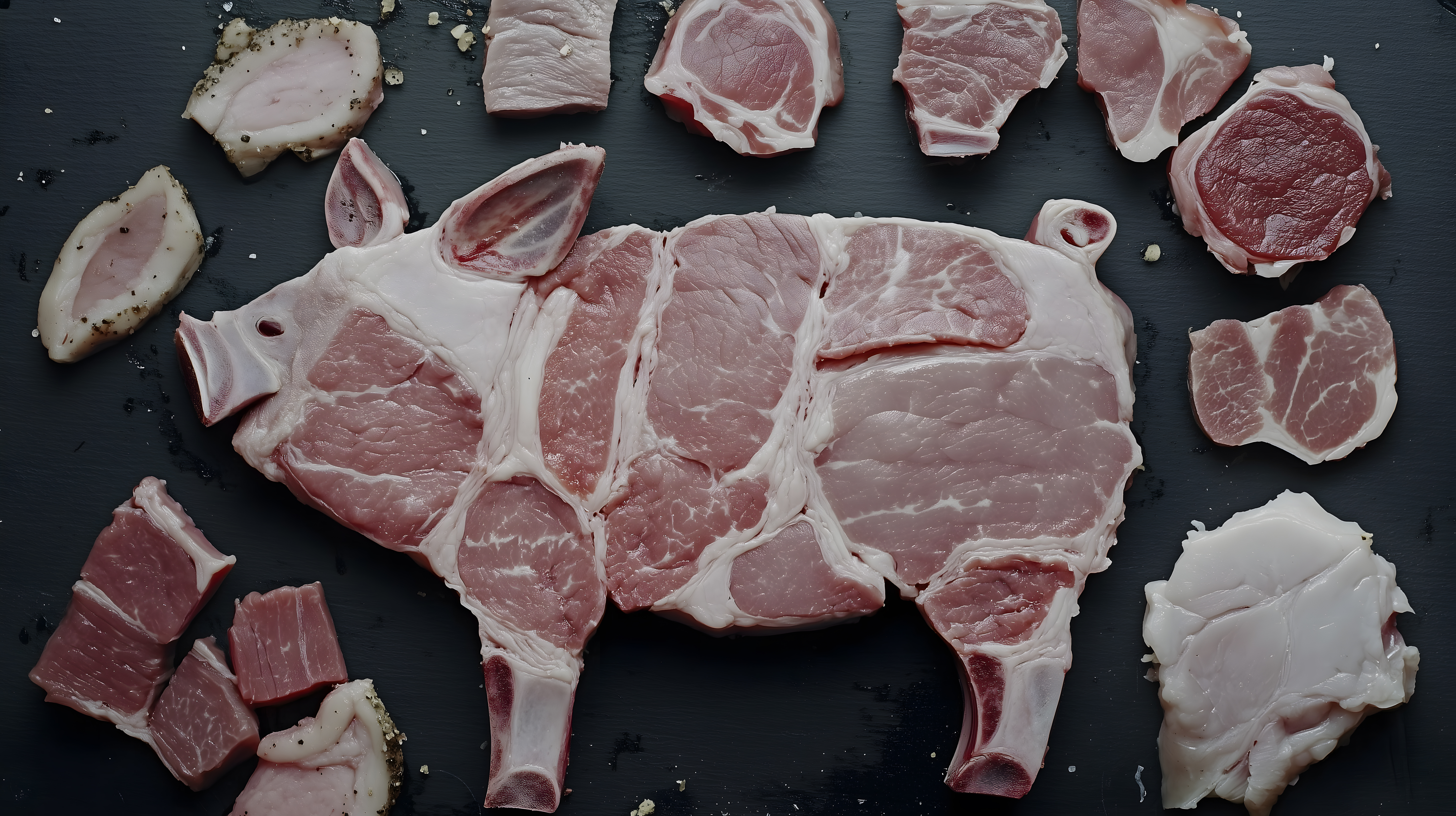Dieses Bild zeigt eine kunstvoll arrangierte Auswahl von rohen Schweinefleischstücken auf einem dunklen Schieferbrett. Die verschiedenen Teilstücke wie Schnitzel, Haxen und andere Fleischstücke sind dekorativ angeordnet und bilden zusammen die Form eines Schweins. Die Optik wirkt natürlich und rustikal, wobei der Kontrast zwischen dem dunklen Untergrund und den hellen Fleischstücken einen spannenden Blickfang bietet. Dieses Foto eignet sich hervorragend als kostenloses Stockfoto für verschiedene Einsatzzwecke in der Blogberichterstattung, Newsletter-Gestaltung, Social-Media-Posts und sogar in Werbekampagnen rund um das Thema Kochen, Ernährung und Gastronomie. Das Bild liegt in hoher Auflösung und unter einer Creative-Commons-Lizenz vor.