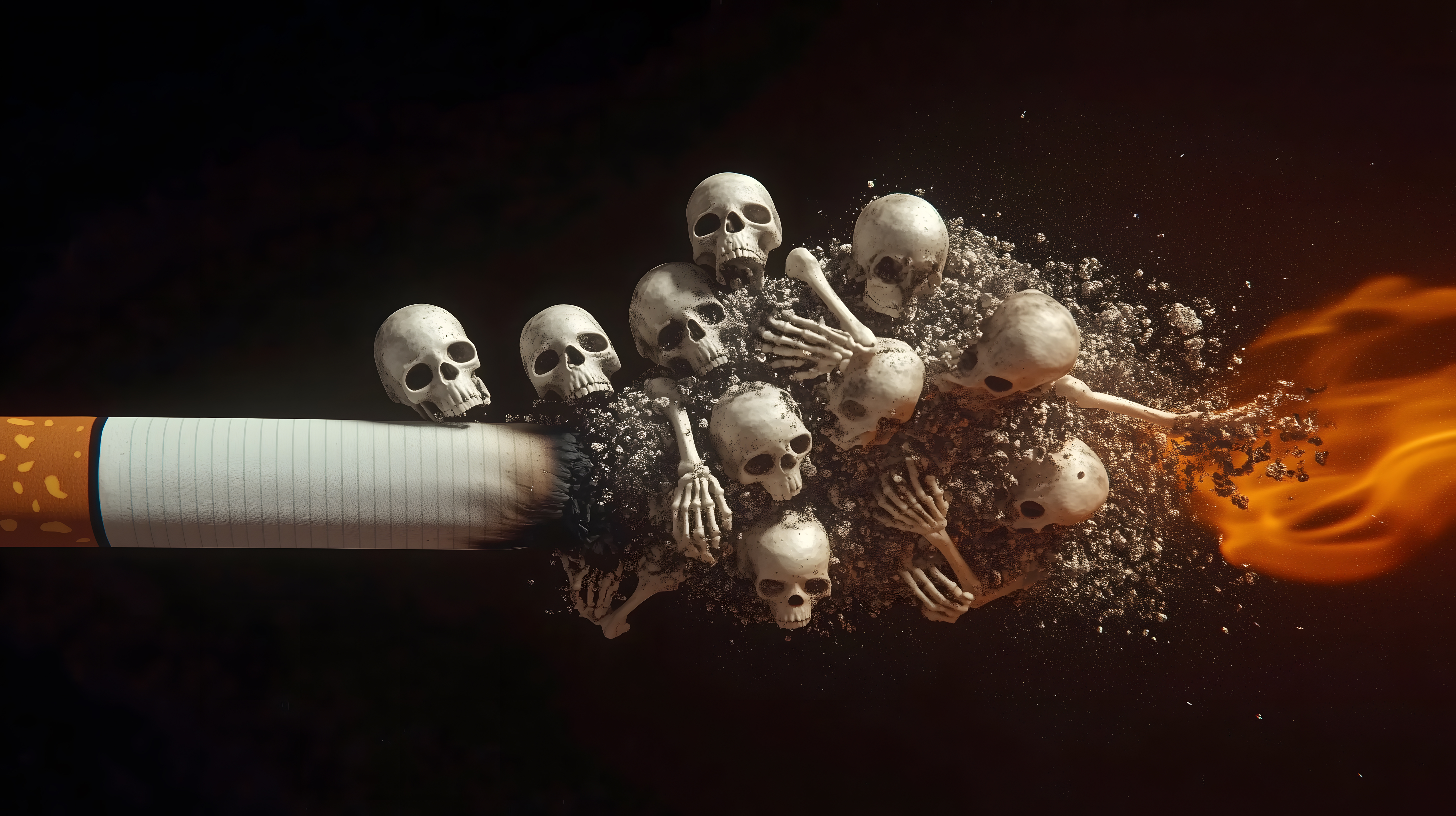 Dieses eindrucksvolle Stockfoto zeigt eine dramatische Warnung vor den gesundheitlichen Folgen des Rauchens. Im Mittelpunkt befinden sich mehrere realistische Schädel, die von Knochenfragmenten umgeben sind und aus einer Zigarette hervortreten. Die düstere Farbgebung in Schwarz, Weiß und Orange sowie die bedrohliche Flamme verleihen dem Bild eine apokalyptische Stimmung. Diese kraftvolle Komposition eignet sich ideal für Projekte rund um das Thema Raucherprävention, sei es in Gesundheitskampagnen, Präsentationen oder Werbematerialien. Das hochauflösende Foto ist unter einer Creative Commons-Lizenz frei verfügbar und kann kostenfrei genutzt werden.
